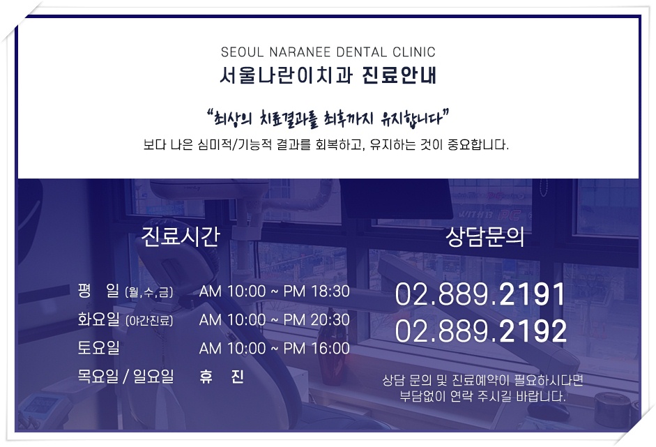 현재 이곳 서울나란이치과교정과에서는 보건복지부에서 인정을 받으신 치과교정과 전문의 송규철 대표원장님께서 풍부한 지식과 경험을 갖추고 환자 한 분씩 처음부터 끝까지 진료를 도와드리고 있습니다. 교정전문치 과로 알려져 있어 난도 높은 과정이 필요한 분들도 어려움 없이 방문해주십니다. 만일 어떠한 문제로 인해 구강상 불편함이 느껴지신다면 언제든지 온라인이나 전화를 통해 편안하게 문의주실 수 있습니다.