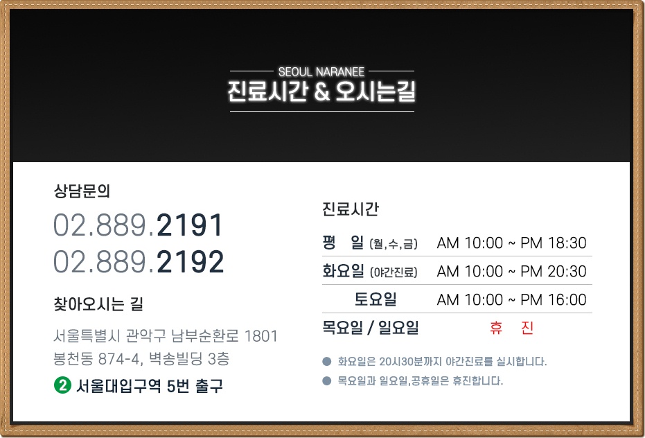 본원에서는 현재 서울대입구역 야간진료 치과로써 치과교정과 전문의인 송규철 대표원장님께서 상주하고 계세요. 치아교정을 중점으로 진료를 봐드리고 있으니 복잡한 난도가 필요하거나 조금 더 신중한 맞춤 과정을 원하신다면 언제든지 편안하게 문의해보실 수 있어요.