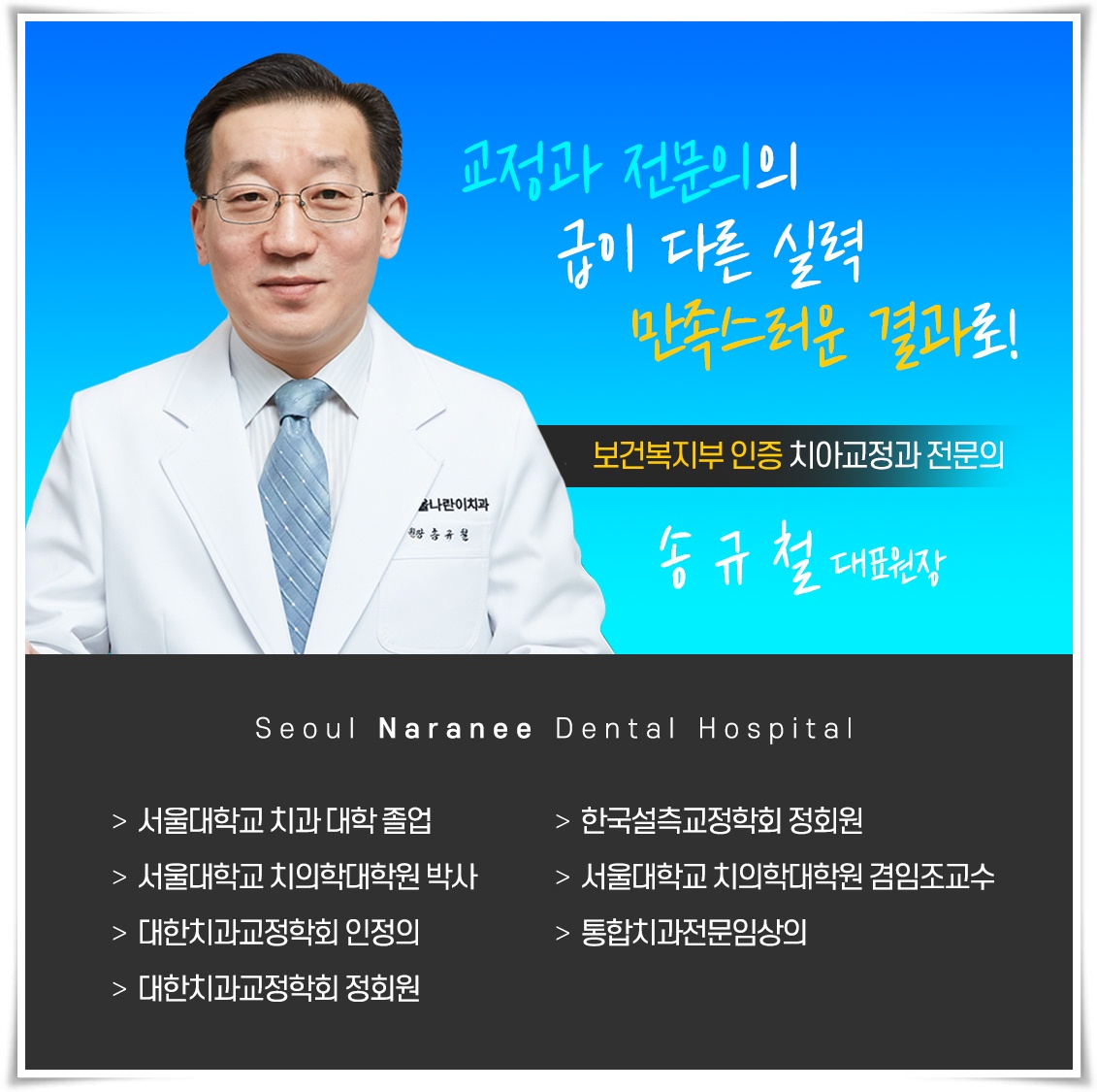 서울나란이치과교정과에서는 보건복지부에서 인정받으신 송규철 대표원장님께서 치과교정과 전문의로써 상주하시며 일대일 진료와 맞춤 계획을 실시하고 계시답니다.