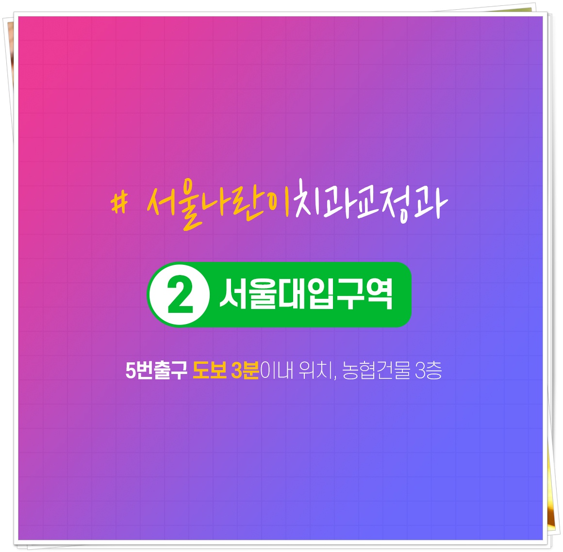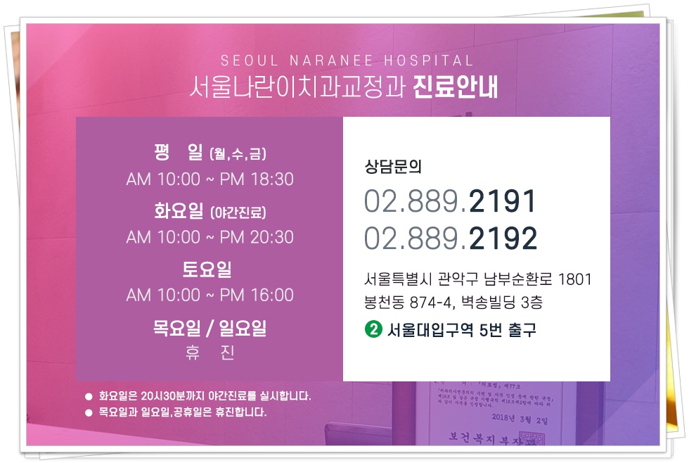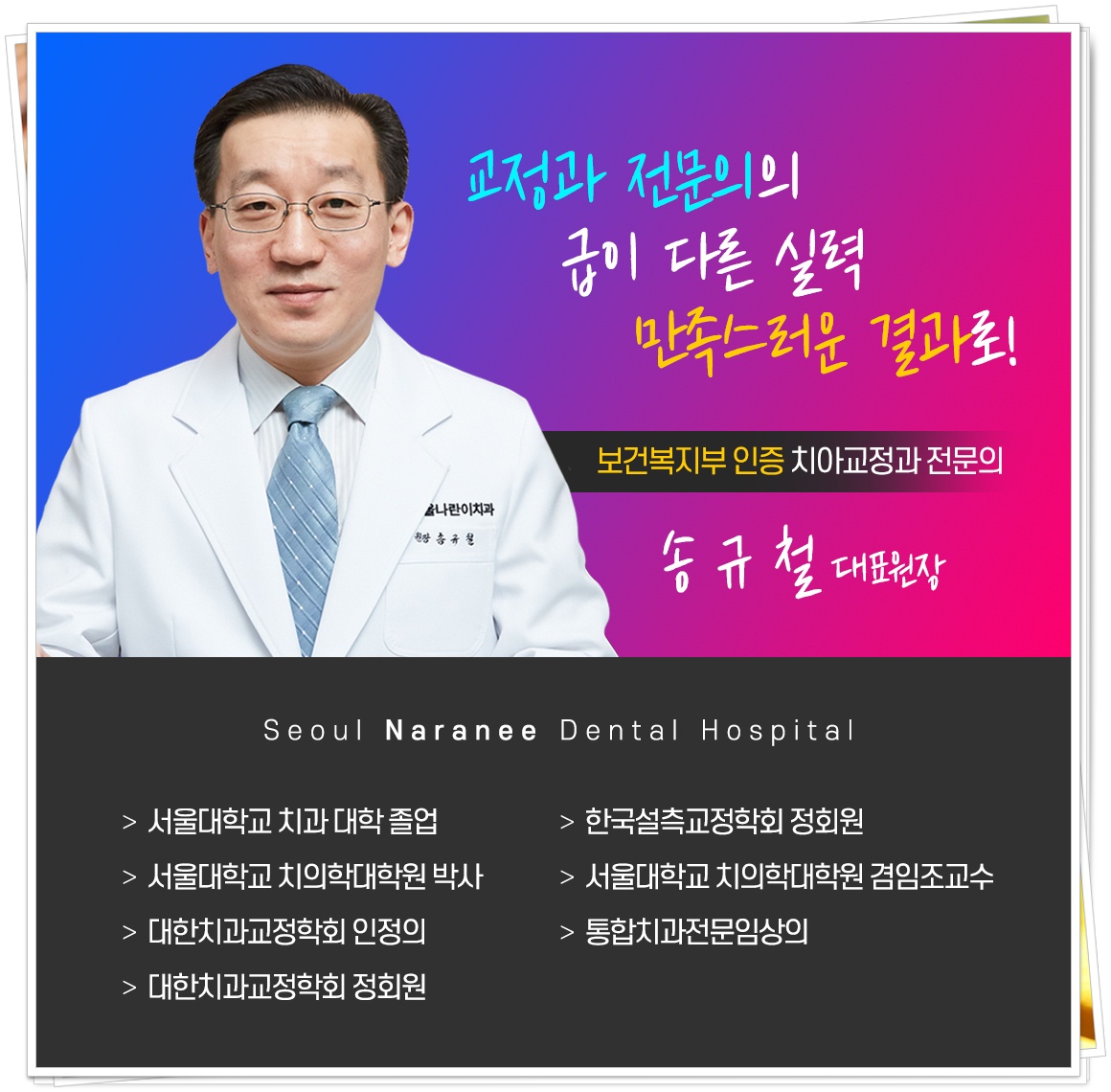 이곳 서울나란이치과교정과는 서울대입구역 5번출구 부근에 위치한 교정전문치과로, 보건복지부에서 인정을 받으신 송규철 대표원장님께서 상주하고 계세요. 보건복지부에서 인정받으신 치과교정과 전문의시니, 겪고 있는 불편한 증상에 대한 원인 해결에 높은 이해도를 가지고 계시기 때문에 신뢰할 수 있는 교정치과랍니다.