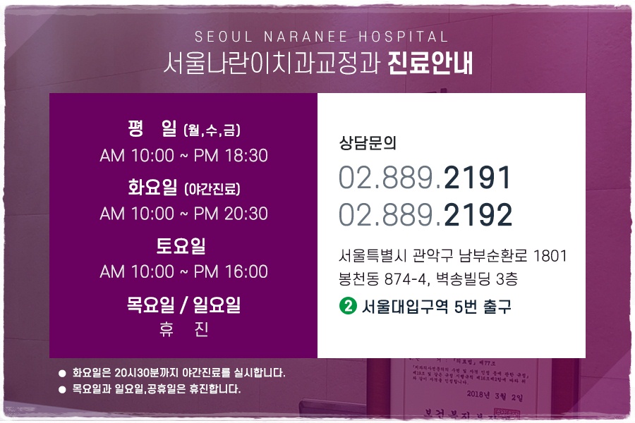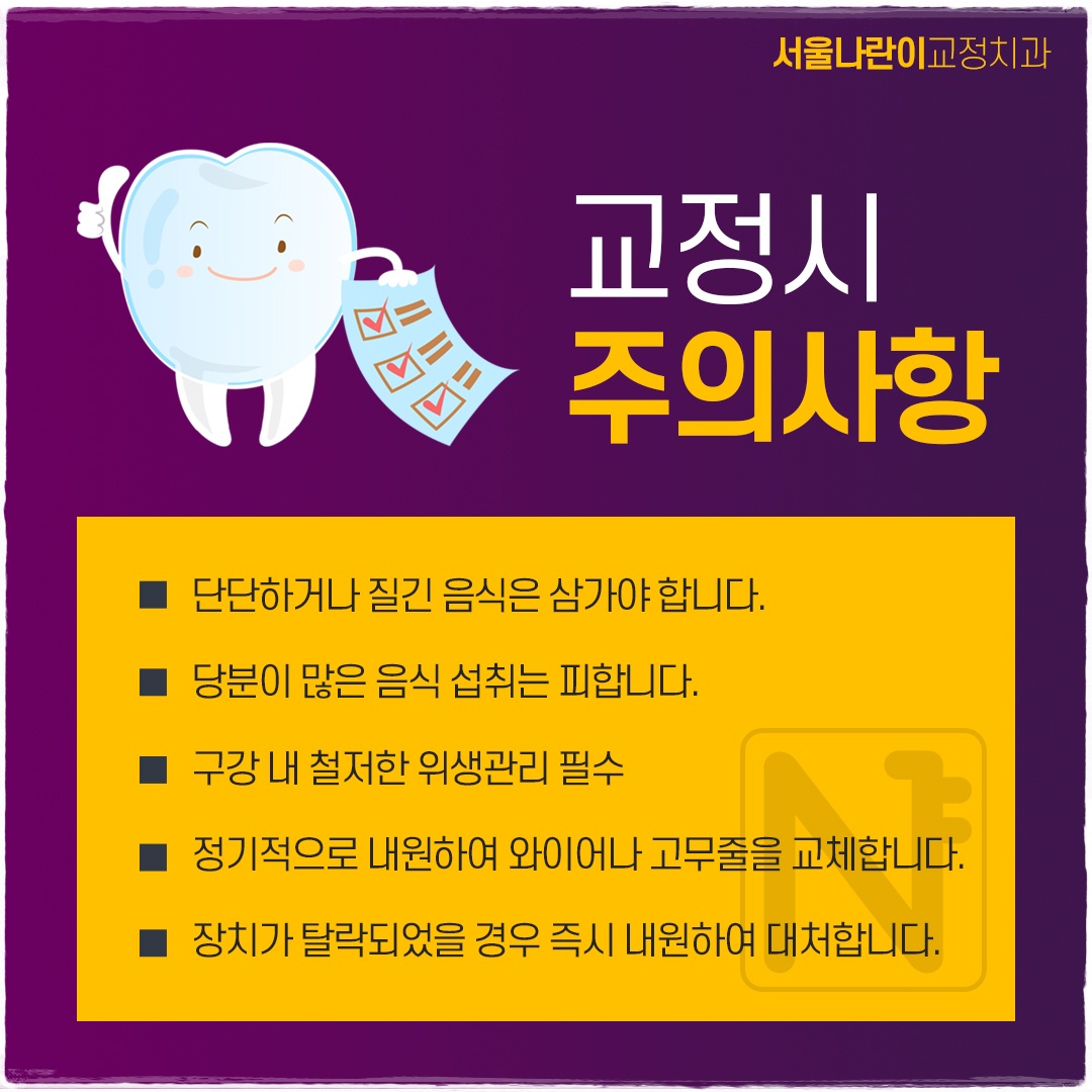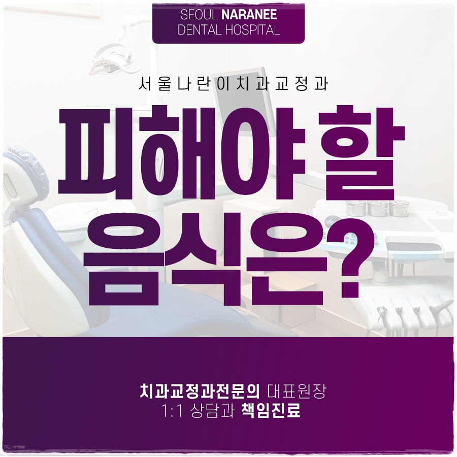 오늘 이렇게 교정 중 피해야 할 음식에 대해 설명해드렸는데요. 좋아하던 음식일지라도 건강한 교정 과정을 진행해보기 위해 조금만 참아보시는 것은 어떨까요? 보건복지부에서 인정받은 치과교정과 전문의 대표원장님께서 직접 진료 보는 ‘서울대 야간진료 치과 서울나란이’에서 알려드린 정보였습니다. 감사합니다.