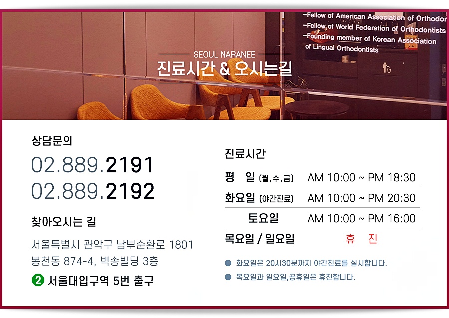 이곳 서울나란이치과교정과는 신림 교정 전문 치과로, 보건복지부 인정을 받으신 치과교정과 전문의가 항상 상주하고 계십니다. 대표원장이 직접 진료보는 곳으로 교정 과목에 대한 이해도가 높으시니 맞춤 과정으로 함께 오랜 시간 잘 해결해나가시길 바랍니다. 궁금하신 점이 있다면 언제든 온라인이나 직접 방문을 통해 문의주시길 바랍니다. 감사합니다.