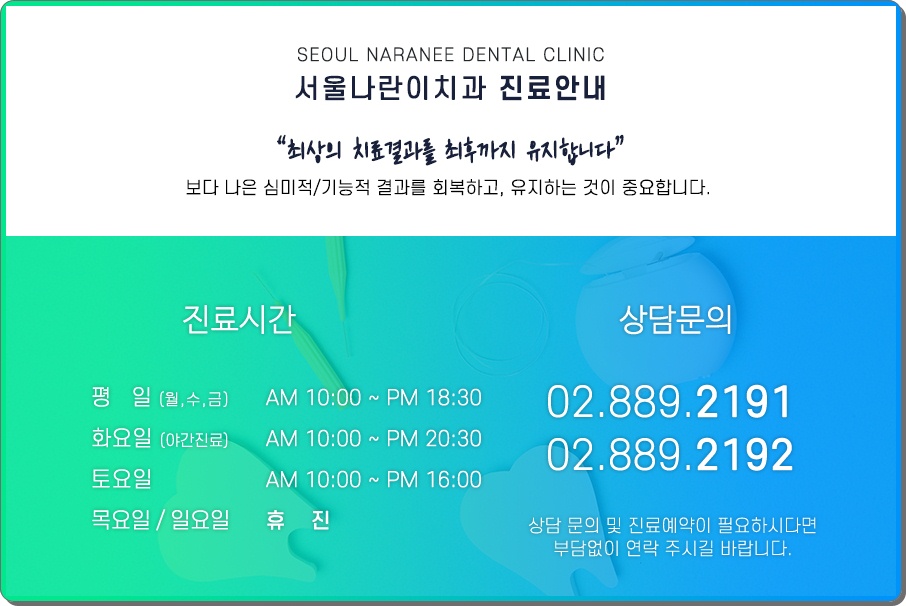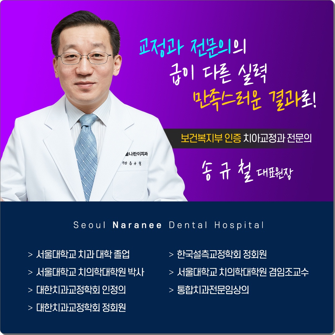 낙성대역치과에서는 보건복지부에서도 인정받으신 치과교정과 전문의 송규철 원장님께서 치아교정을 진행하고 계십니다. 한 분야에서 오래도록 경험하시고 지식을 쌓아오셨기 때문에 믿고 맡길 수 있을 만큼의 신뢰도를 갖추고 계십니다. 서울나란이치과교정과는 교정 전문 치과로 직접 전문의가 여러분의 고민을 해결해드리고 있으니 진료시간을 참고하셔서 내원해주시길 바래요.
