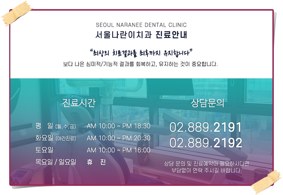 만약 이곳의 도움이 필요하시다면 언제든지 상담이나 방문을 해주셔도 좋습니다. 이곳은 매주 화요일 오후 8시 반까지, 토요일은 오후 4시까지 진료를 보고 있습니다. 야간진료를 하는 곳이나 토요일진료를 하는 곳을 찾고 계시다면 시간적인 부담 없이 예약해주시길 바랄게요. 오늘도 행복한 하루 되시길 바랍니다. 감사합니다. :)
