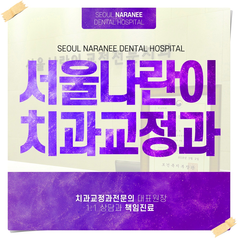 안녕하세요. 서울나란이치과교정과입니다. 이곳은 보건복지부에서 인정받으신 교정과 전문의 송규철 대표원장님께서 직접 진료하는 곳으로, 일대일 상담과 검사, 진행, 그리고 마무리까지 모두 책임지고 진행하는 곳입니다.