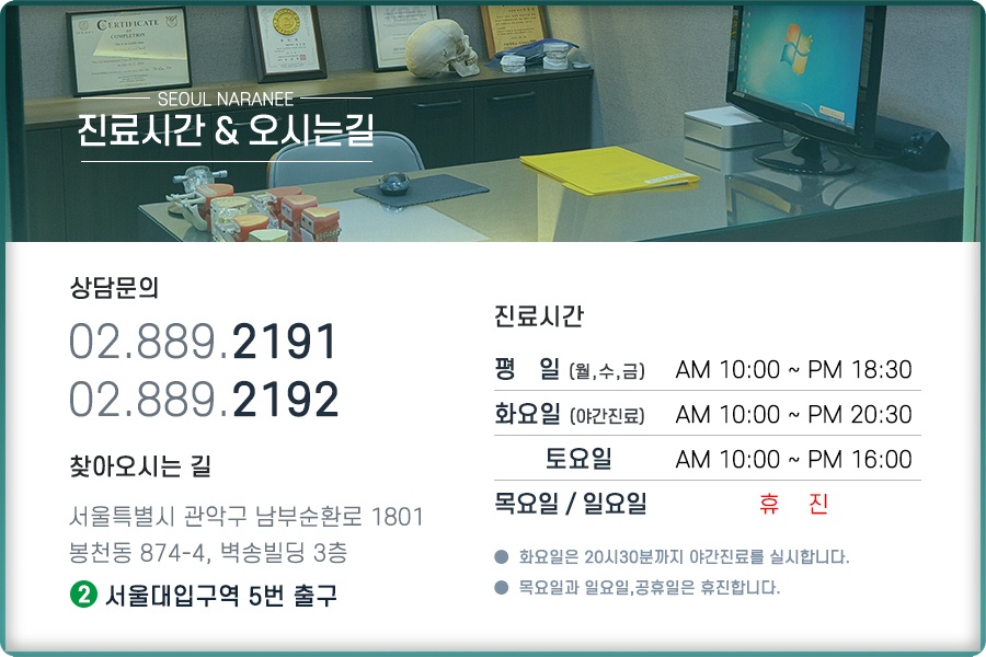 이곳에서는 신림 부근에 위치한 교정전문치과로 보건복지부 인정 교정과 전문의 대표원장님께서 직접 환자 여러분들의 문제들을 직접 다루고 계세요. 장치에 대한 세심한 설명까지 덧붙여 해주시니 편안하게 상담을 받아보셔도 좋을 것 같아요. 이곳은 온라인상담도 함께 진행 중으로 집에서도 궁금한 점을 해결해보시길 바래요.