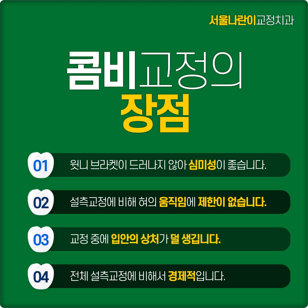 윗니는 설측으로 부착하여 실시하기 때문에 미소를 지을 때나 말을 할 때 노출되는 윗니가 깔끔해 설측에 비해 만족도도 높은 편입니다. 그래서인지 설측을 선택하려 하다가도 평균 2년간의 기간을 고려해 콤비를 선택하시는 분들도 많아요. 오늘은 설측과 콤비의 차이점에 대해 알아보았는데요. 이런 정보 하나하나 숙지해주시고 상담 받으실 때 꼭 유용한 내용이 되길 바랄게요.
