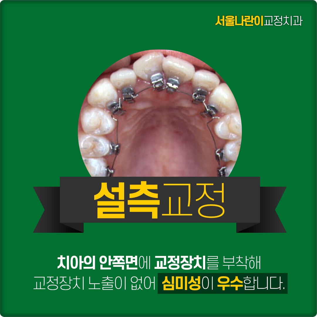 설측교정은 장치가 드러나는 것이 극도로 꺼려질 때 선택해볼 수 있어요. 말 그대로 혀가 위치한 안쪽에 부착해 교정을 실시하는 것으로, 부정교합을 교정할 때에도 원활하게 사용할 수 있답니다. 또, 치면 바로 위 즉, 바깥쪽에 부착되어 그 두께만큼 입이 튀어나와 보이는 현상도 없기 때문에 많은 분들이 찾고 계세요.