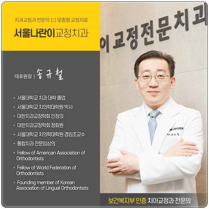 보건복지부인증 교정과 전문의 송규철 대표원장님이 상담부터 장치 부착, 사후관리까지 원스톱으로 진행하고 있습니다. 치열이 고르지 못하여 치아교정을 고심하고 있다면, 늦었다 생각하지 마시고 편하게 방문하시고 상담 받아보시기 바랍니다.