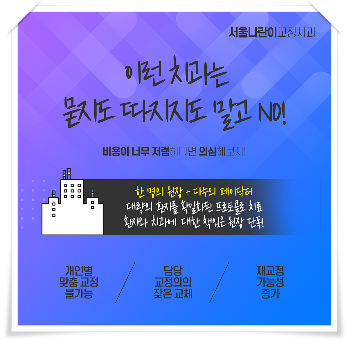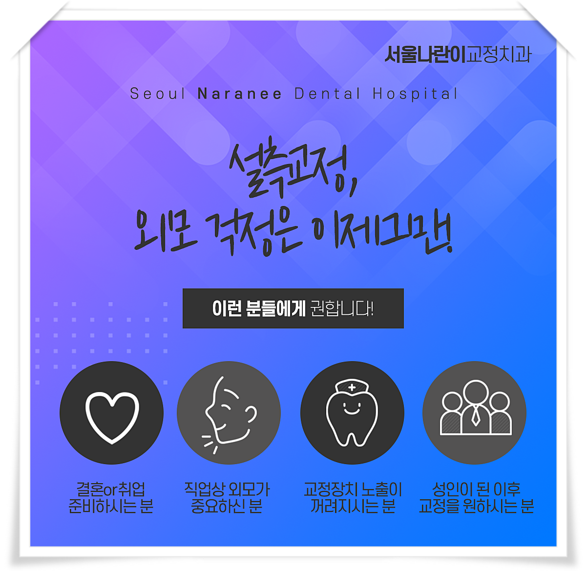 어떤 장치를 선택할 것인지는 의료진과의 상담을 통해 가장 적합한 것으로 선택하면 되는데요. 봉천치아교정 서울나란이치과교정과는 여러 교정 경험을 가진 의료진이 각 환자의 특성에 맞도록 케어하고 있으니 안심하고 방문해 보실 수 있답니다.