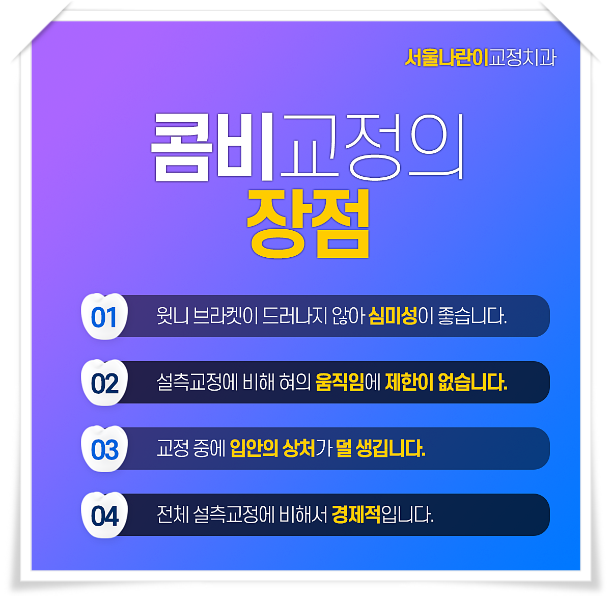 설측은 치아의 뒷면에 장치를 부착하며, 콤비의 경우는 윗니는 설측으로 아랫니는 순측으로 부착하여 경제성을 높이고, 치면 뒤에 장치 부착 시 생기는 불편함을 보완할 수 있습니다.