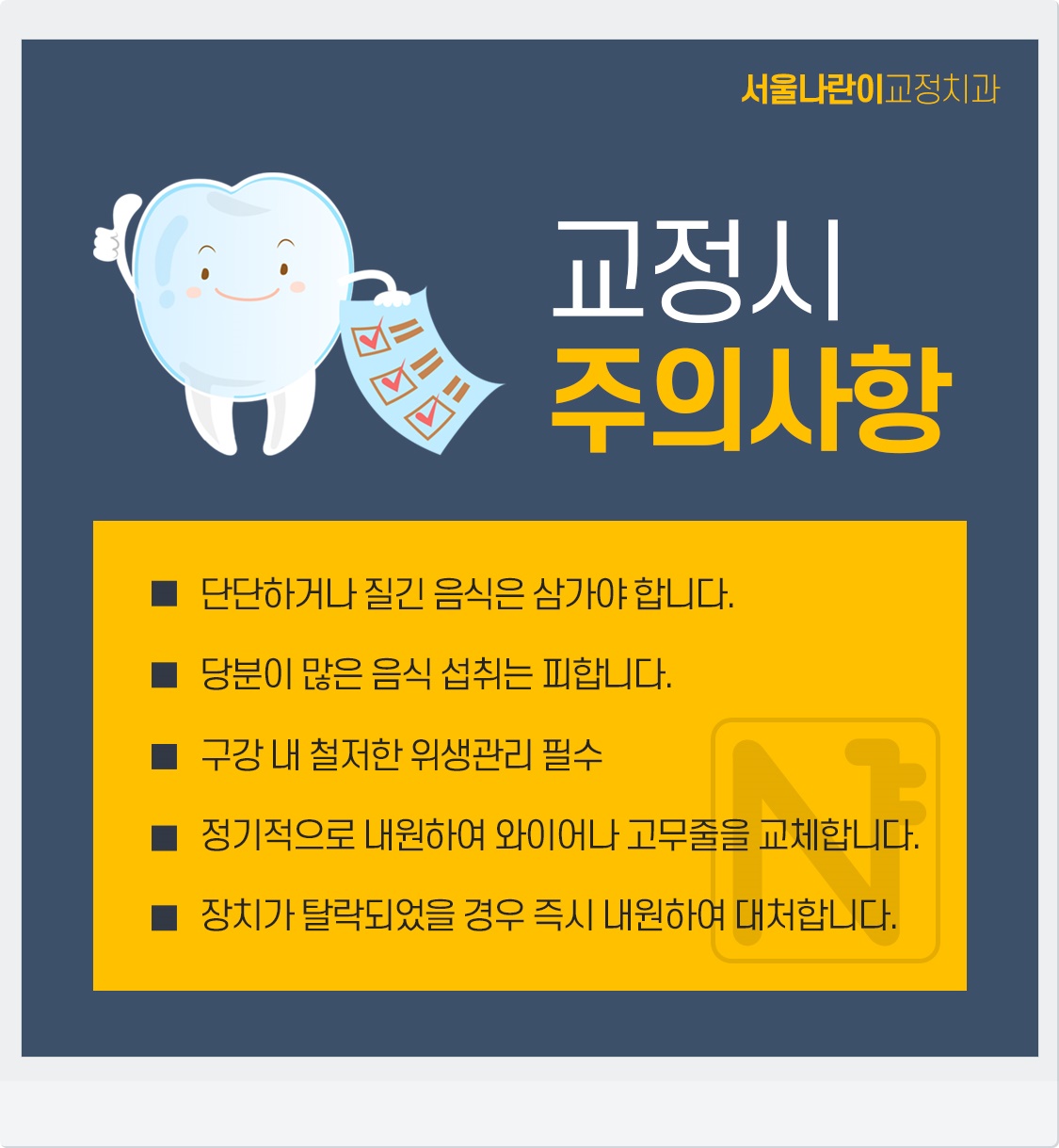 이 외에 잇몸에 염증이 생겼다든지 잇몸 퇴축이나 치아 탈회와 같은 현상이 일어나면 즉시 치과를 찾아 적절한 치료를 받는 것이 좋습니다. 시간과 비용을 들여 교정한 만큼 오래도록 건강하고 고른 치아를 유지하려면 꼭 기억하시길 바라요!