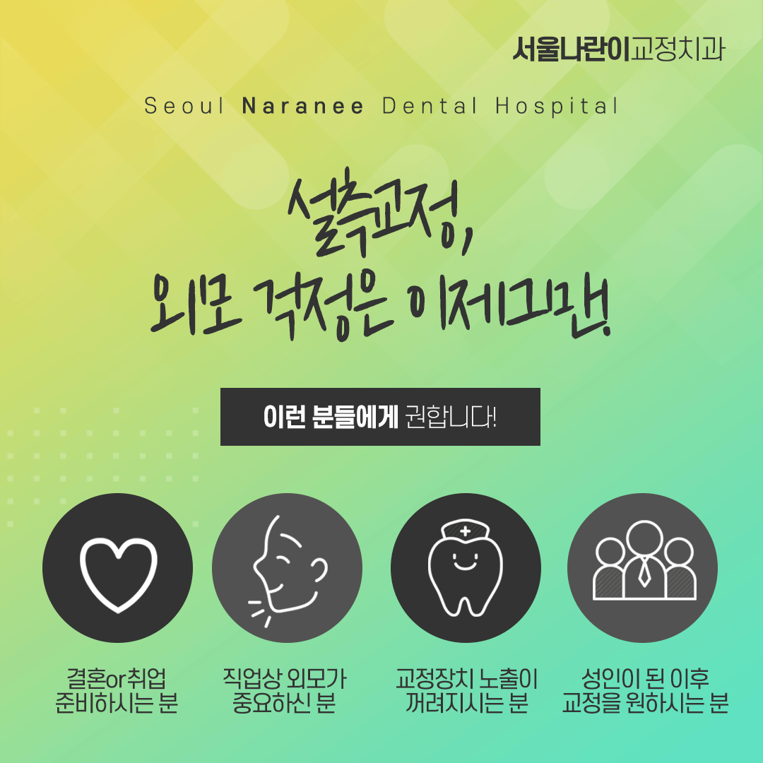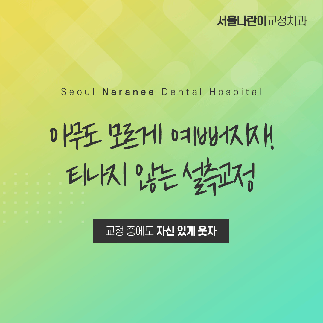 서울나란이치과교정과 역시 해당 증상을 진단하고 도움을 드릴 수 있는데요. 티 나지 않는 교정으로 심미성까지 챙기고 싶다면 망설이지 말고 아래 링크를 통해 상담을 신청해 주세요.