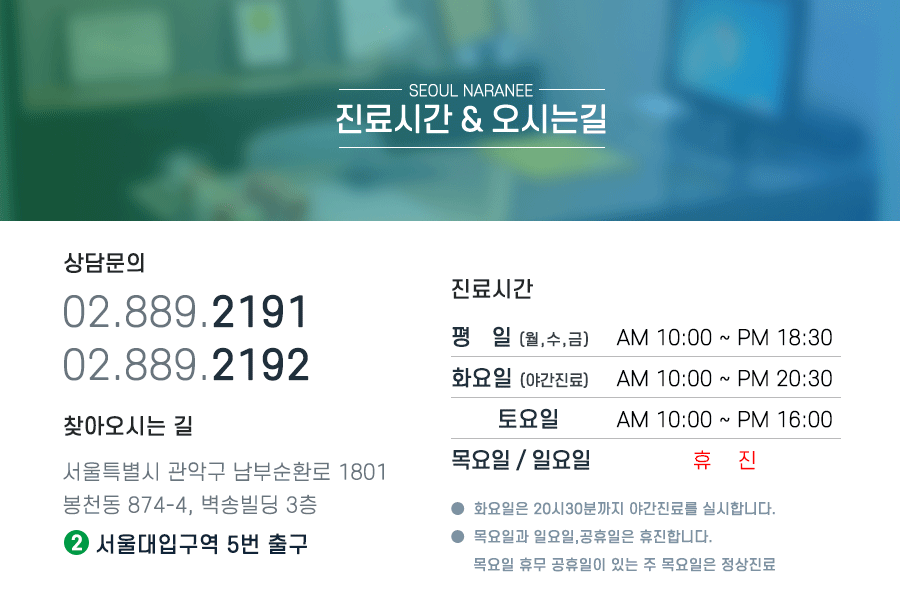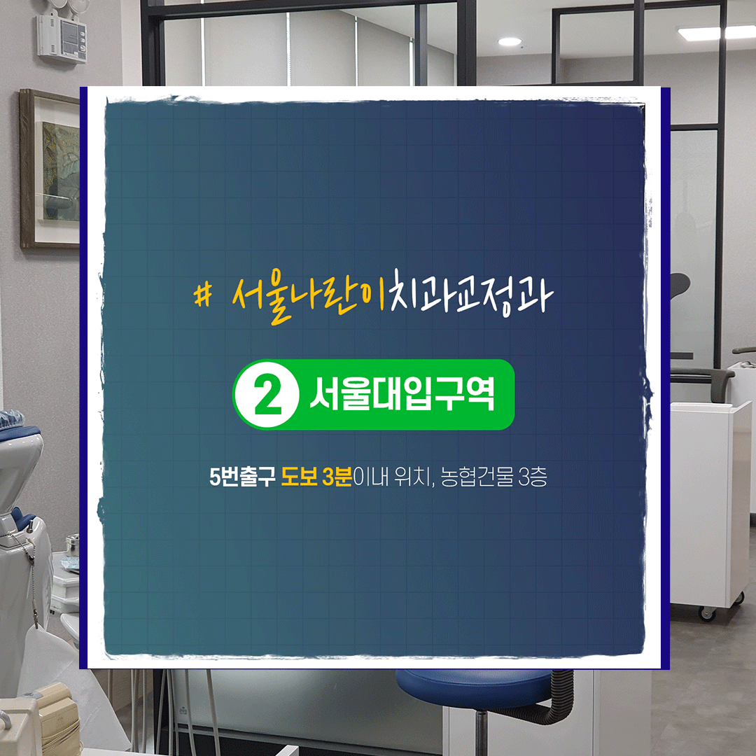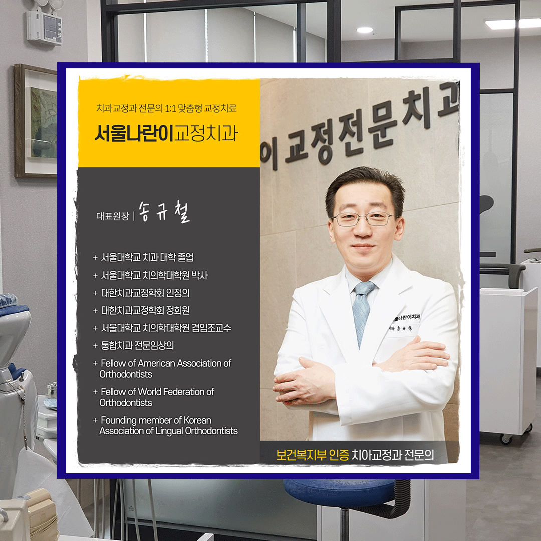 서울나란이치과 교정과 서울대입구역 부근 남부순환로에 위치한 본원은 서울대 치과대학을 졸업한 송규철 교정과 원장님이 직접 진료에 임하고 있는데요. (치과교정과 전문의_보건복지부 인증) 심미적인 부분을 고려한 콤비교정, 설측교정, 다시 교정 등 여러 가지 방법을 통해 부족했던 치아의 기능적, 심미적인 부분을 회복해 드리고 있습니다.