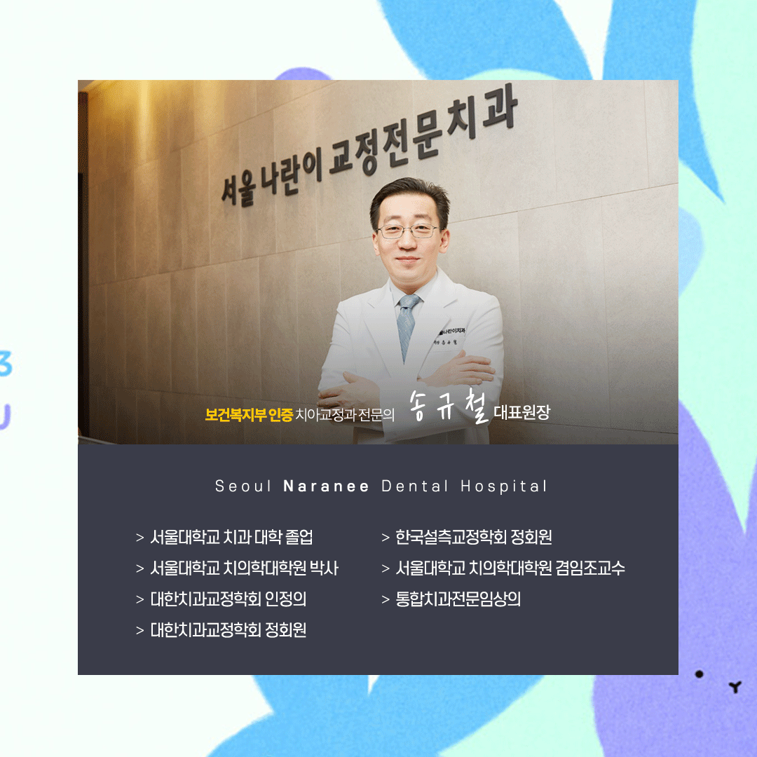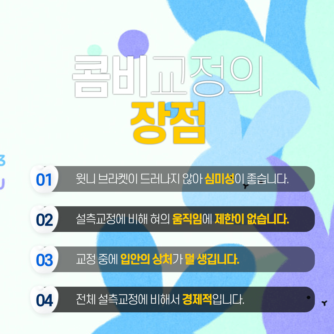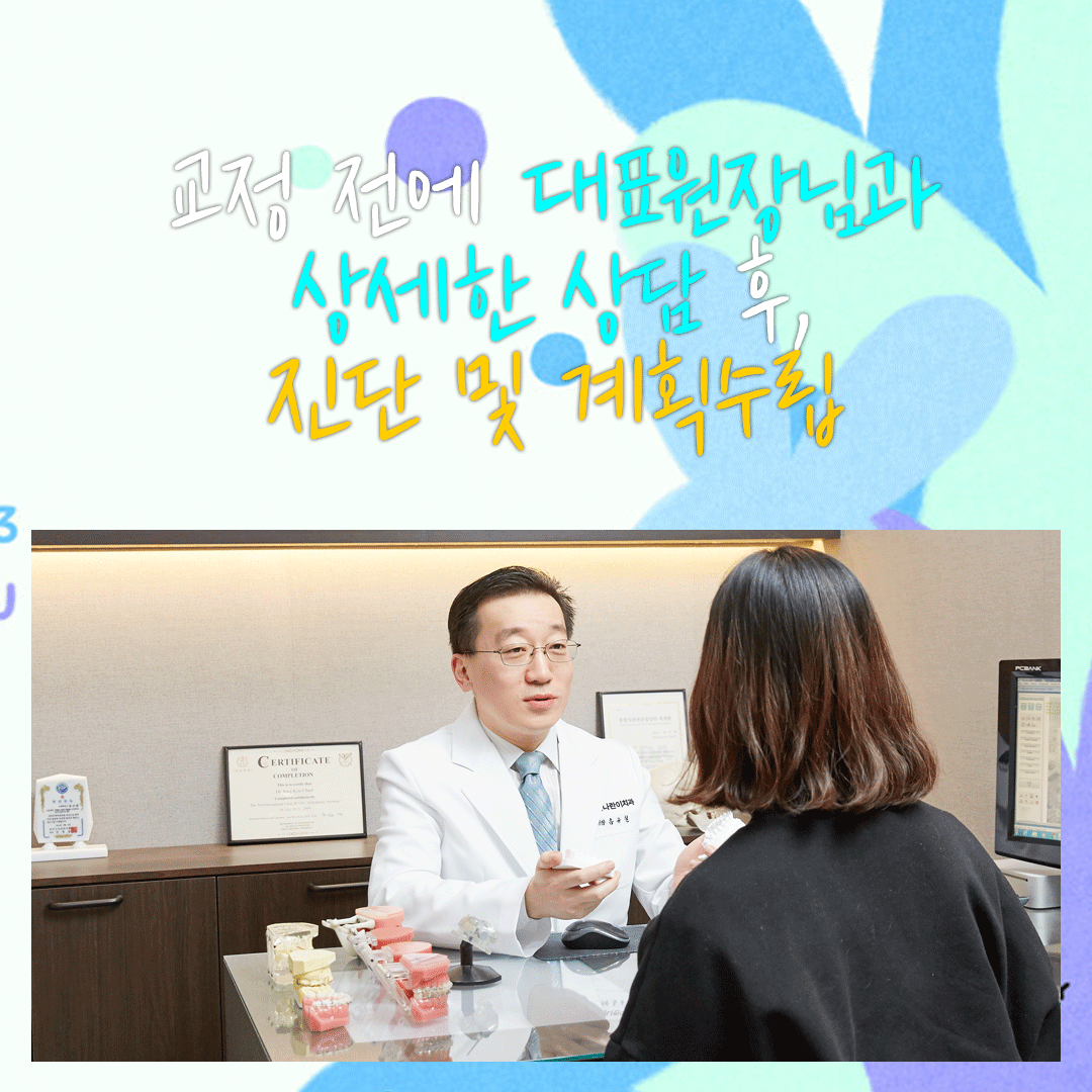 기존의 전체적인 교정보다 상대적으로 저렴하고 치료기간이 짧은 부분 교정치료지만, 치열이 비정상적으로 어긋나거나 어금니를 포함한 전체적인 개선이 필요할 경우에는 부분교정이 아닌 전체교정이 올바른 방법인데요. 치아는 문제점을 인지한 상태에서 방치해두면, 시간이 지남에 따라 그 문제는 더욱 안 좋은 방향으로 진행되기 때문에 가벼운 마음으로 가까운 치과에 방문해 현재의 상태를 개선할 수 있는 방법을 알아보는 것을 추천드립니다.