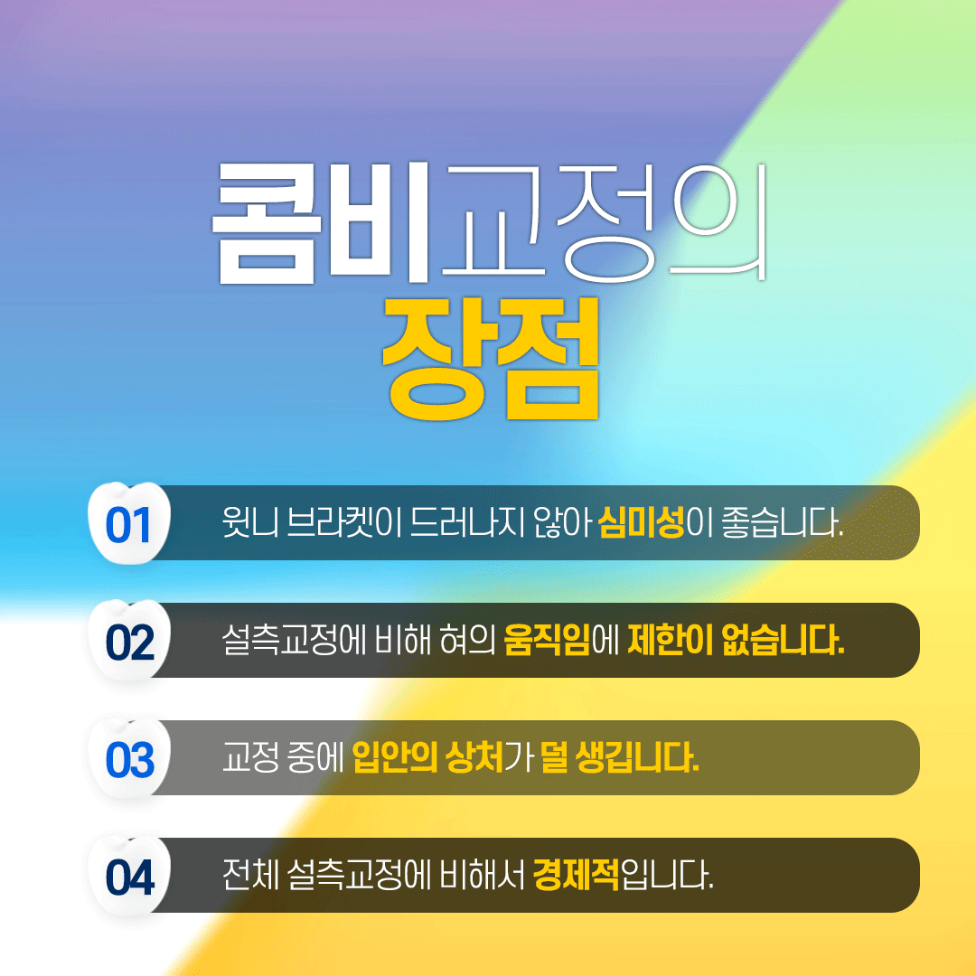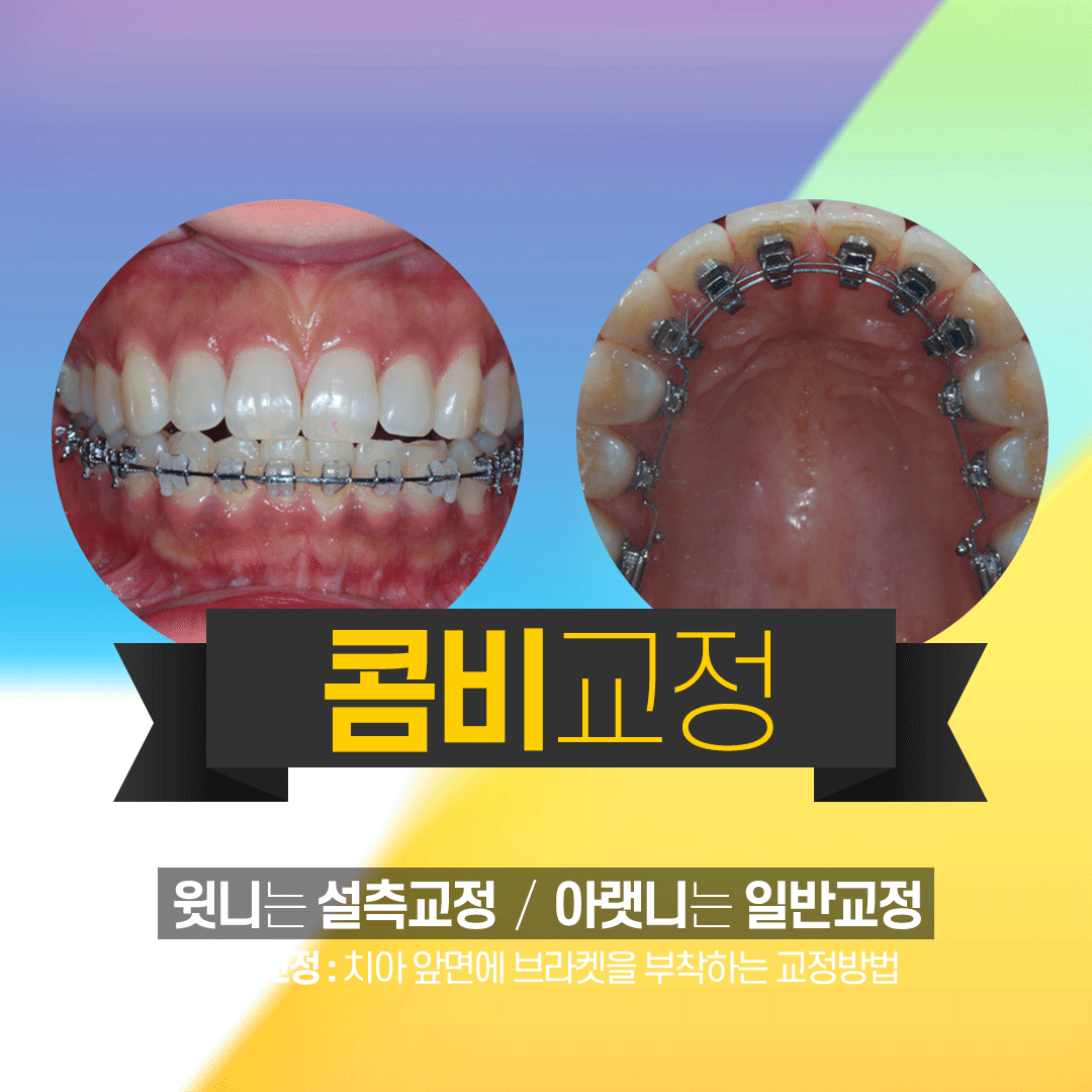 콤비교정은 위아래 치아에 서로 다른 교정장치를 사용하는 방법으로 위쪽에서 설측을, 아래쪽에는 일반, 순측교정을 진행해 교정장치가 최대한 덜 띄게 하면서도 비용 부담은 조금 더 낮출 수 있습니다. 주로 말하거나 웃을 때 많이 노출되는 윗니에 설측교정을, 아랫니에 일반교정 장치를 사용하게 되는데 이때 심미적 장점을 더욱 높이기 위해 눈에 덜 띄는 일반교정장치인 클리피씨와 같은 장치를 사용하게 됩니다.