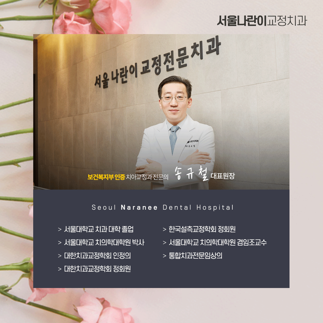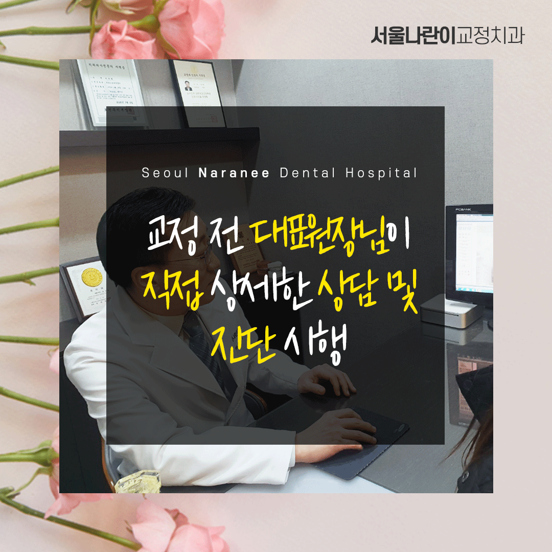참고로 서울나란이치과 교정과 의원은 다시 교정(치아재교정)을 위해 찾아오는 분들이 많이 계신데요. 교정 도중에 과정을 그만두었거나, 교정 도중에 치과가 사라져버려 교정치료를 계속하지 못한 경우에도 도움을 받아볼 수 있겠습니다. 공장형 치과가 아닌 한 명의 원장님께 도움 받아보세요.