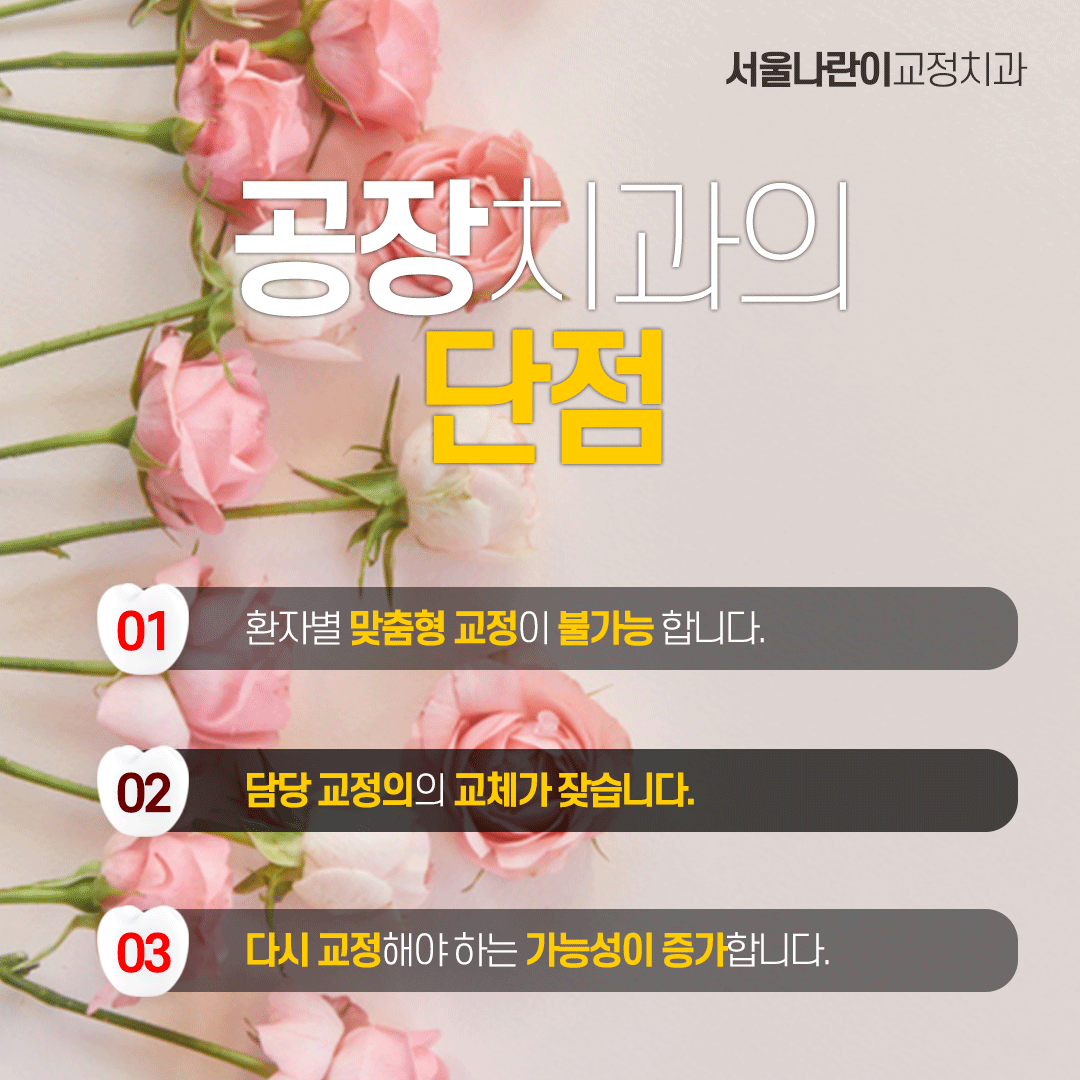 따라서 공장형 치과를 방문하면 만족스런 콤비교정 과정이 이루어지지 않을 수 있는데요. 콤비교정은 심미성과 경제성을 만족시키는 효율적인 교정장치이지만 더 만족스러운 결과를 얻기 위해서는 다양한 교정 경험이 많은 실력있는 전문의에게 받는게 매우 중요합니다. 그래서 공장형 치과가 아닌 담당 교정의가 대표원장님으로 계시는 교정전문치과를 방문해야 하는데요.