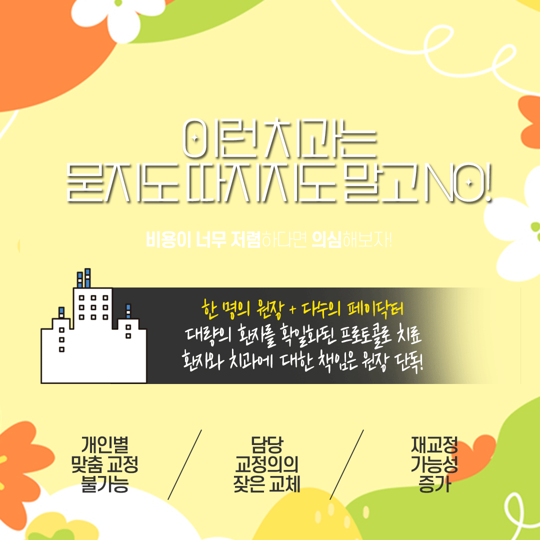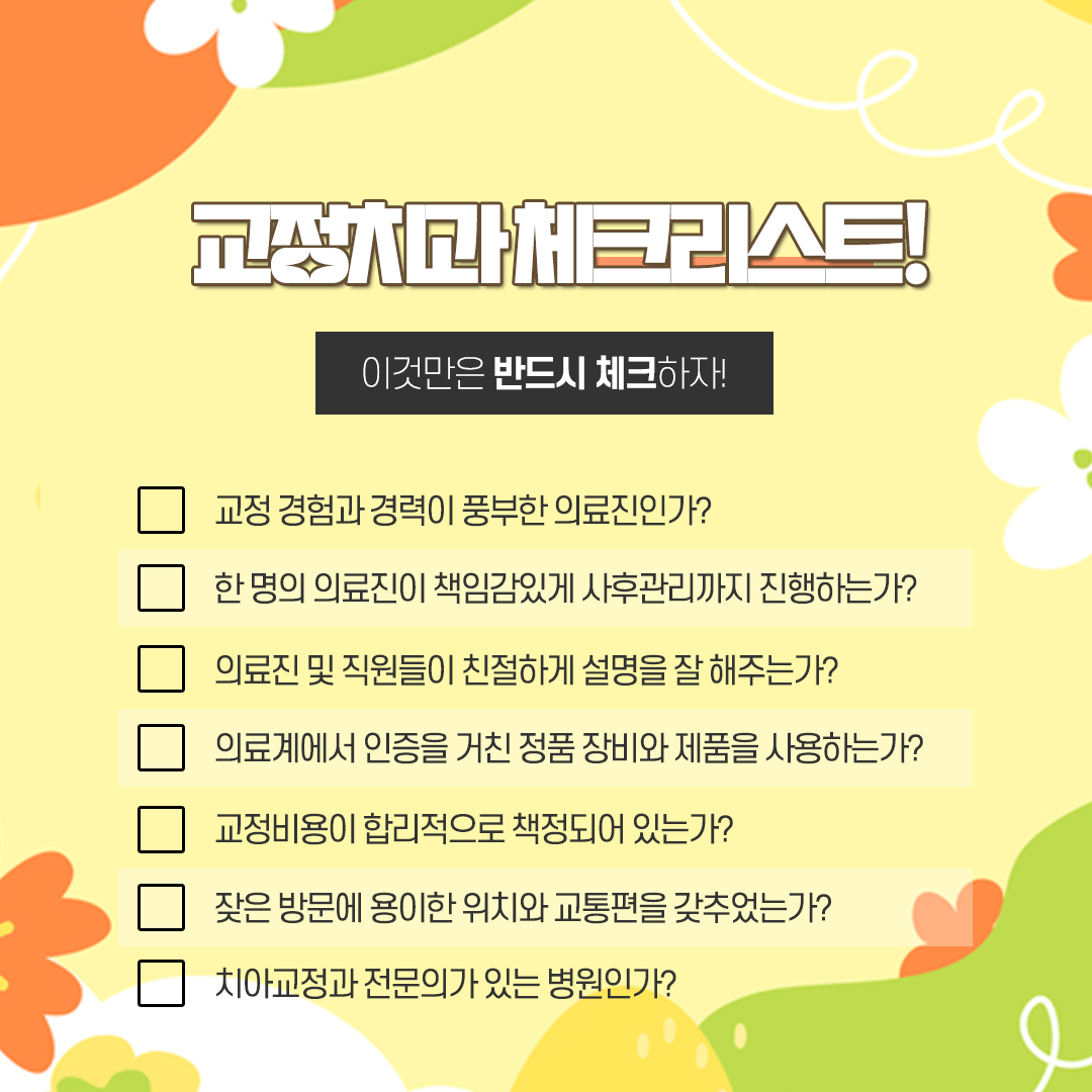 평소 부정교합이나 벌어진 치열, 돌출입 등 콤플렉스를 가지고 있었다면 치아교정을 통해 심미적, 기능적 개선 효과를 볼 수 있습니다. 치아교정은 이미 대중화된 치료법으로 물리적인 힘으로 치아를 이동시켜 가지런하게 치열을 정렬할 수 있도록 해주는 치료방법인데요. 하지만 치아교정을 받고 싶어도 바로 받을 수 있는 것은 아니기 때문에 주기적인 구강검진을 통해 치아상태를 확인한 후 어떤 교정방법으로 진행할지를 선택해야 하며 충분한 상담 후 교정치료를 진행하는 게 좋습니다.