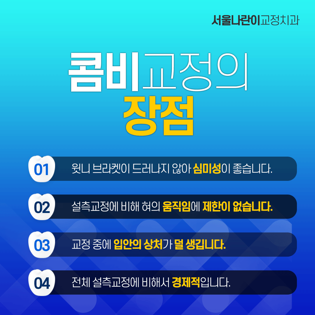 다음으로 콤비교정은 윗니에는 치아 뒷면에 브라켓을 부착하는 설측교정, 아랫니에는 치아 앞면에 브라켓을 부착하는 순측교정을 혼합한 방식으로 윗니는 심미성이 좋고 아랫니는 혀의 움직임이 자유롭다는 장점을 가지고 있습니다. 콤비교정은 전체적인 설측교정과 비교했을 때 비용적인 면에서 부담이 덜하다는 장점이 있는데요. 앞서 언급한것처럼 맞춤제작이기 때문에 비용적으로 부담이 될 수 있습니다. 따라서 합리적으로 여름방학 콤비교정을 진행하려면 이런 부분까지 고려해야 하겠죠.