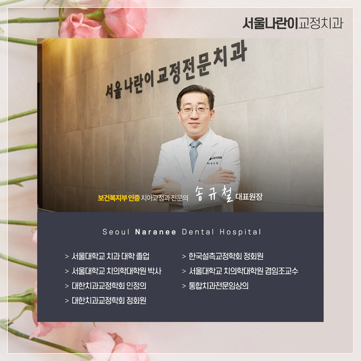 물론 교정 전에는 반드시 턱뼈와 치아의 관계적 특성, 치아와 잇몸, 그리고 주변조직의 성질까지 고려해야 하는데요. 그러려면 다양한 증상의 치아교정 치료 노하우가 있는 치아교정 전문의에게 교정을 받아야 하겠죠?