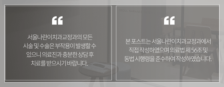 40대 이상의 환자들은 다른 사람의 눈에 보이지 않는 교정 치료를 원하는 경우가 많은데요. 이런 경우에는 설측면을 이용한 설측교정을 진행해볼 수 있습니다. 서울나란이치과 교정과 의원은 서울에 위치한 설측교정전문치과인데요. 1:1 책임진료는 물론 사후관리, 재교정까지 케어 받아볼 수 있으니 환자의 입장에서 꼼꼼한 진료가 이루어지고 있습니다.