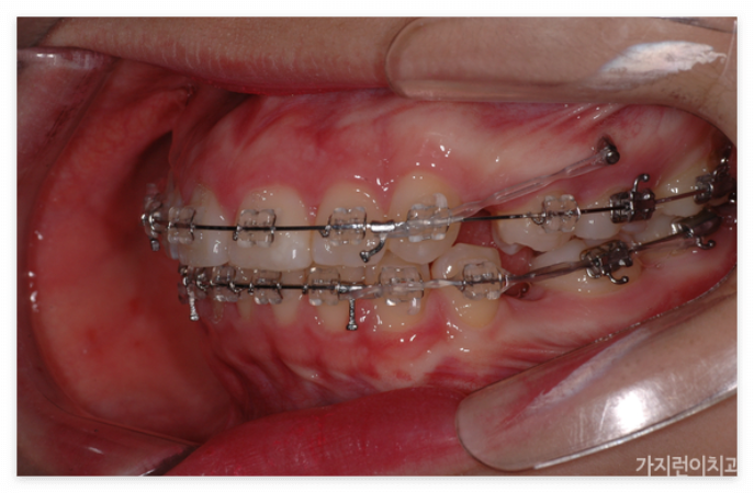 앞으로 돌출된 치아를 구조적으로 안쪽으로 집어넣기 위해서는 공간의 확보가 필요합니다. 그래서 많은 분들이 발치를 진행하는데요. 위와 같은 경우도 상하악 제1소구치를 발치한 후에 충분한 공간을 확보한 후에 진행을 하였습니다. 특히 발치가 무조건 안 좋고 비발치가 좋은 것이라고 오해하는 경우가 있는데 발치할 케이스임에도 비발치로 진행하게 되면 오히려 더 안 좋은 결과를 안아볼 수 있기 때문에 상악 전치의 후방이동을 위한 충분한 공간확보를 위한 과정이라고 이해하면 되겠습니다. 본원에서는 서울 거미스마일 교정을 위해 미니스크류를 식립해 상악 전치를 위로 올리는 힘을 추가 했습니다. 미니스크류를 이용하면 개선할 충분한 힘이 가해지기 때문에 상하악 전치가 동시에 이동할 수 있습니다.