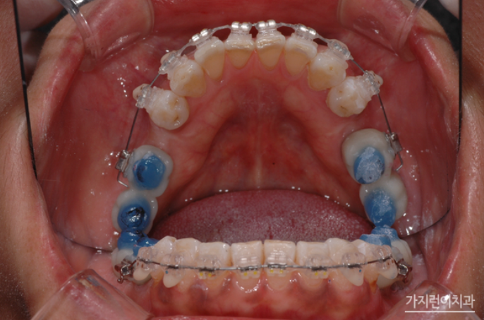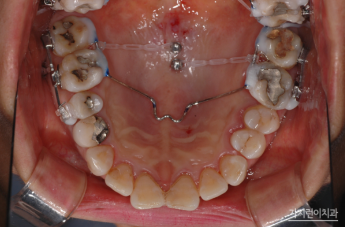 이후 치료가 시작된 지 1년이 지났고 상악 작은 어금니를 발치해 안정적인 교정을 진행하셨는데요. 안정적인 교정을 위해 상악 설측교정 장치는 두개의 와이어를 사용하는 탄댐설측교정 장치로 진행했습니다.