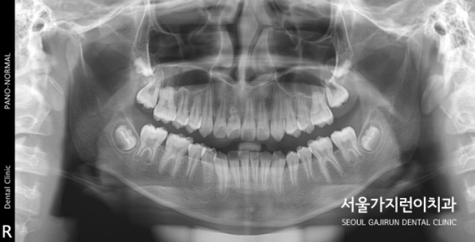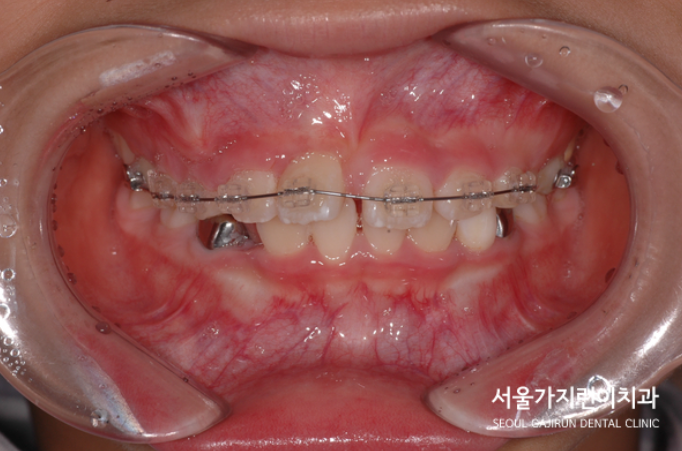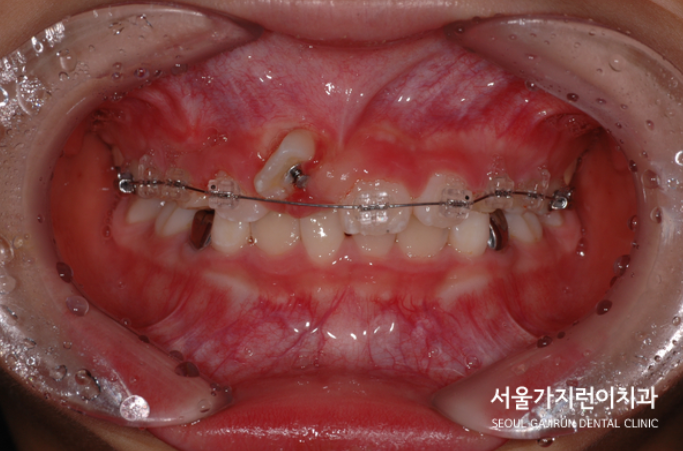 환자의 경우 눈으로 봤을 때는 자연스런 증상인것처럼 보이지만 엑스레이 화면으로 봤을 때는 상악 앞니가 180도로 돌아간 상태인 것을 확인할 수 있었는데요. 거꾸로 치아가 숨어있는 상태로 공간 확보가 별도로 필요하지 않은 상태에 치과를 방문해주었습니다. 이런 경우는 치아의 뿌리가 짧기 때문에 치근 흡수의 가능성도 보여 매복치의 견인을 이끌어주는 교정을 진행해야 했는데요.