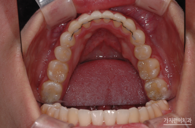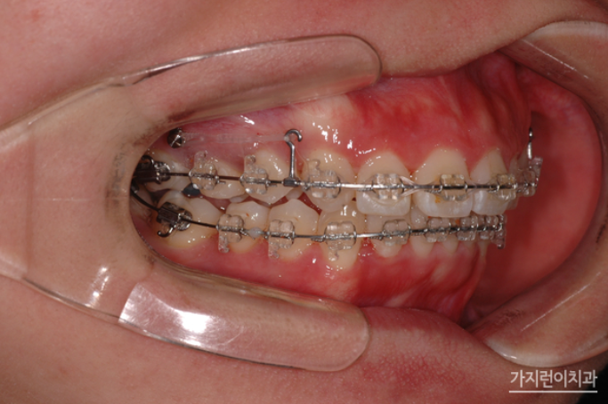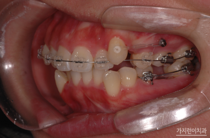 위 환자의 경우 상악 돌출입 증상과 더불어 심한 충치로 인해 발치가 불가피한 악조건을 갖고 있었는데요. 충치는 정도가 심하면 결국 발치를 하게 되고 인공치아를 식립해야 하는 과정을 밟게 되는데요. 그런데 환자의 경우 불규칙적인 치열의 재배열과 더불어 콤플렉스로 자리잡은 돌출입도 교정으로 진행해볼 수 있었습니다. Modified Bonded Cantilever Spring (MBC spring) 교정으로 사랑니에 직접 부착해 사랑니를 세우는 교정을 진행하게 되었는데요. 사랑니가 쓰러져 있는 상태라면 기존의 교정장치를 부착하기 어렵기 때문에 개발된 장치를 사용하고 있습니다. 그러면 장치를 착용한 후의 경과를 볼까요?