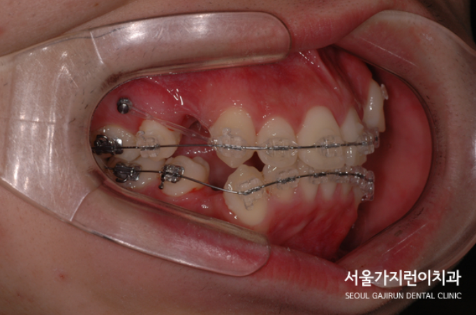 본원에서는 치료초기부터 미니스크류를 식립해 치아교정을 진행하고 있습니다. 돌출입의 경우 입을 뒤로 밀어넣는 힘이 필요하기 때문에 상당한 이동공간이 필요한데요. 이런 경우에는 억지로 비발치로 진행하는 것보다는 발치 후 발치 공간을 미니스크류를 이용해 상하악 앞니를 배열하고 앞으로 나온 치아를 후방으로 밀어넣는 치료가 동반되어야 하겠습니다. 미니스크류를 식립하게 되면 잇몸뼈에 식립하기때문에 미니임플란트 교정이라고 불리기도 하는데요. 이때 잇몸뼈에 식립한 미니스크류를 지지다 삼아 교정용 고무줄을 걸어 힘을 주어 돌출 부위를 후방으로 밀어넣게 되는 것입니다.