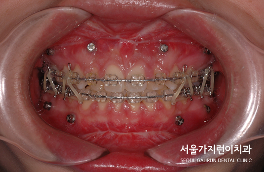 여기에 심하게 정출되어 있었던 상악 좌측 제2대구치를 충분히 함입시키기로 결정하고 교합을 정상적으로 맞추기 위한 치아교정이 이루어졌는데요. 환자분의 경우 비대칭과 주걱턱 문제의 해결은 교정만으로 불가능하다는 판단 하에 양악 수술을 결정하였습니다. 실제로 억지로 치아교정을 했다가 시간과 비용만 낭비하는 경우가 있는데요. 이럴 때 교정전문치과를 방문하면 어떤 방법으로 정상교합을 맞출 수 있는지, 수술적인 방법이 동반이 되어야 하는지 여부를 체크해볼 수 있겠습니다. 환자분의 경우 유견치 발치 및 교합을 맞추는 문제를 선 교정한 후 양악 수술울 진행하는 순서로 진행이 됐는데요. 교정장치 외에도 미니스크류와 교정용 고무줄을 이용해 치료를 이어나갔습니다.