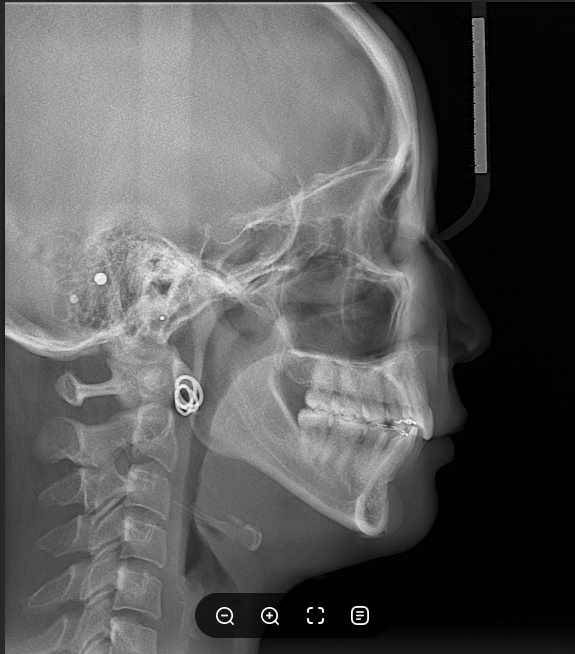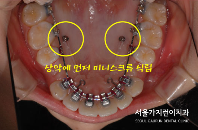그래서 환자분의 경우 상악 치아에 미니스크류를 식립하고 상악 치열 전체를 후방으로 이동시켜드렸습니다. 발치를 하지 않고도 충분히 개선해볼 수 있었죠. 비발치로도 충분히 돌출입 교정을 진행해본 건데요. 여기에 심한 무턱 증상의 경우 환자분의 구강상태에 따라 다를 수 있는데 발치유무의 경우 환자마다 허용치가 다르기 때문에 상세한 설명 후 논의를 거쳐 진행해볼 필요가 있었어요. 환자분의 경우 상악에 먼저 미니스크류를 식립해 진행했고 이후 상하악 소구치 발치 공간을 이용해 상악 전치를 뒤로 넣게 플랜을 수립했습니다.