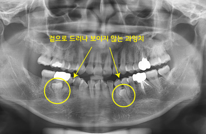 사진을 보면 아래에 보이지 않는 과잉치가 숨어있는 것을 볼 수 있어요. 모든 과잉치가 해당되는 것아는 니며 과잉치의 위치와 크기, 주변 치아와의 관계를 충분히 살펴본 후에 치과 전문의의 소견에 따라 치아교정을 시행해볼 수 있는데요. 잇몸 속이나 턱뼈 속에 숨어있어 눈에 띄지 않는 과잉치들이 많으니 이런 경우에는 엑스레이나 CT 촬영을 통해 확인해볼 수 있어요.