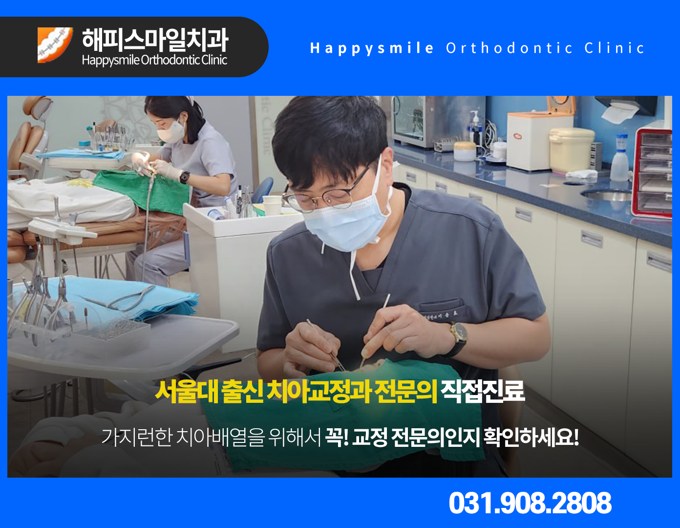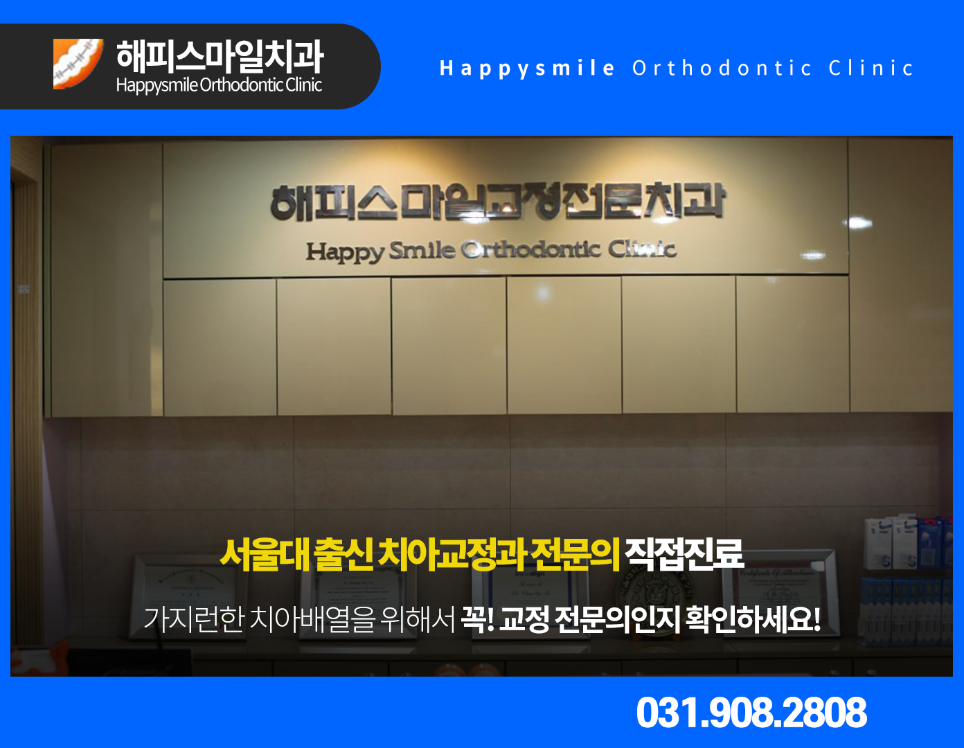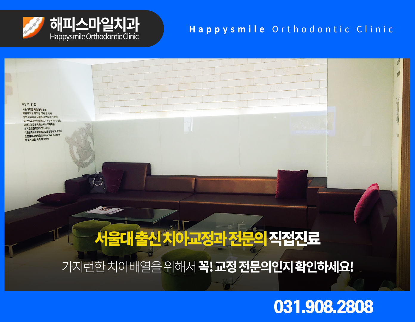 마두역 치과 추천 치아교정 잘하는곳 해피스마일치과 의원은 10년이 넘도록 한 곳에서 오직 교정치료만을 전문적으로 하고 있는 치과입니다. 그동안 많은 환자 여러분들의 추억들을 함께 하고 있기도 한데요. 딱딱한 병원의 느낌이 아닌 포근하고 가족같은 치과가 되기 위해 도움을 드리고 있습니다. 본원의 대표원장님께서는 서울대 치과대학을 졸업한 치아교정 전문의십니다.
