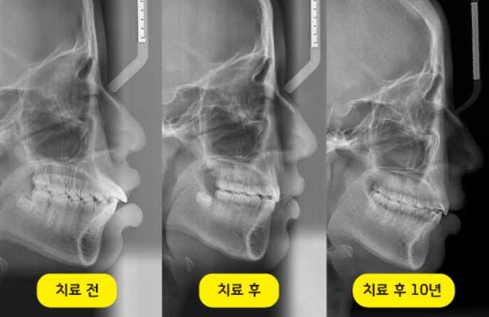 위 환자분의 경우 치료 전과 후, 치료후 10년이 경과한 후에도 저희 신논현교정치과를 찾아 관리를 받아보고 계신데요. 안정적으로 유지되고 있는 것을 확인할 수 있습니다. 청소년의 치아교정은 망설이다 교정의 골든타임을 놓치는 경우가 많은데요. 심한 경우에는 치아교정만으로 해결할 수 있는 문제를 수술적인 방법으로 도움을 받아야 할 수도 있기 때문에 비교적 시간적인 여유가 될 때 본원을 찾아 도움을 받아보는 게 좋겠습니다.