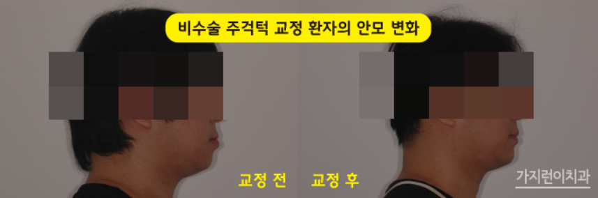 다음 케이스는 작은 어금니를 발치한 후 상악에 미니스크류를 이용해 교정을 진행한 케이스인데요. 상악은 설측으로 진행해 심미성을 살렸고 하악은 순측으로 진행하는 콤비교정방식으로 무턱이 개선된것을 신논현역치아교정 전후 사진을 통해 확인해볼 수 있었습니다.