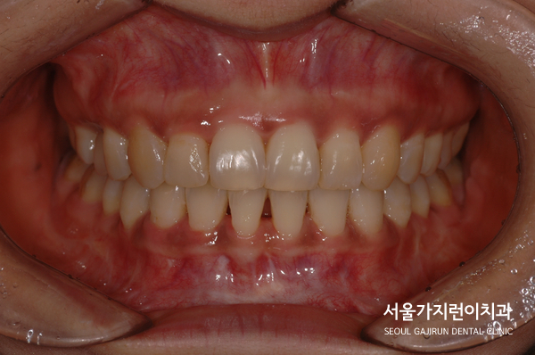 정면에서 봤을 때 윗니가 아랫니를 덮어 전혀 보이지 않는 상태였죠.