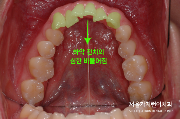 여기에 상악 어금니 중심선이 덧니 쪽으로 쏠려 있어 대칭이 맞지 않고 어금니 자체가 전방으로 쏠려 있는 것을 확인할 수 있었는데요. 여기에 하악 전치의 심한 비뚤어짐으로 가지런이 치아배열을 하기 위해서는 별도의 공간이 필요해보였습니다. 게다가 주걱턱 성향이 나아지지 않은 상태로 방문해주셨기 때문에 엑스레이를 찍어본 결과 상악 어금니보다 하악 어금니들이 전방으로 튀어나간 상태로 볼 수 있었는데요. 사실 사진으로도 그렇고 눈으로 봐도 그렇고 치아교정을 한다면 발치가 필요한 상황으로 보일 수 있었습니다.