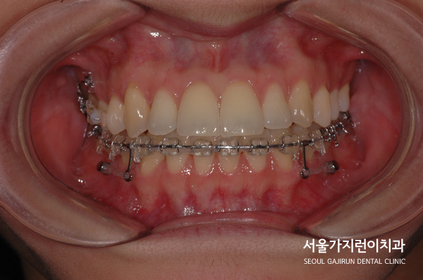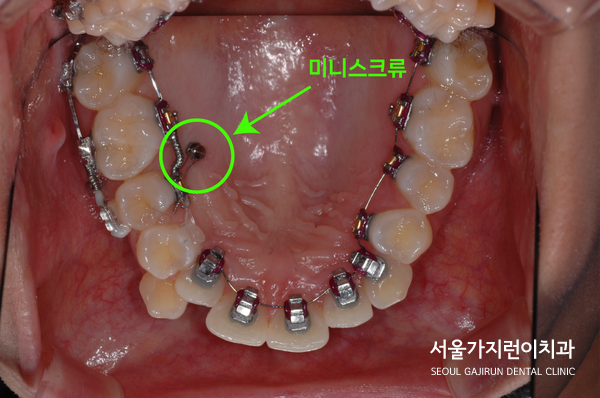 환자 분의 경우 미니스크류를 이용해 상악 우측 어금니를 후방으로 이동시키는 과정을 밟았는데요. 좌측 어금니와의 대칭을 맞추기 위해 진행한 상황입니다. 또 하악의 가지런한 치아배열을 만들기 위해 미니스크류를 적극적으로 활용했는데요. 미니스크류는 치아이동에 필요한 강한 힘을 균등하게 줄 수 있기 때문에 위, 아래 식립한 것을 상기 사진으로 확인해볼 수 있습니다.