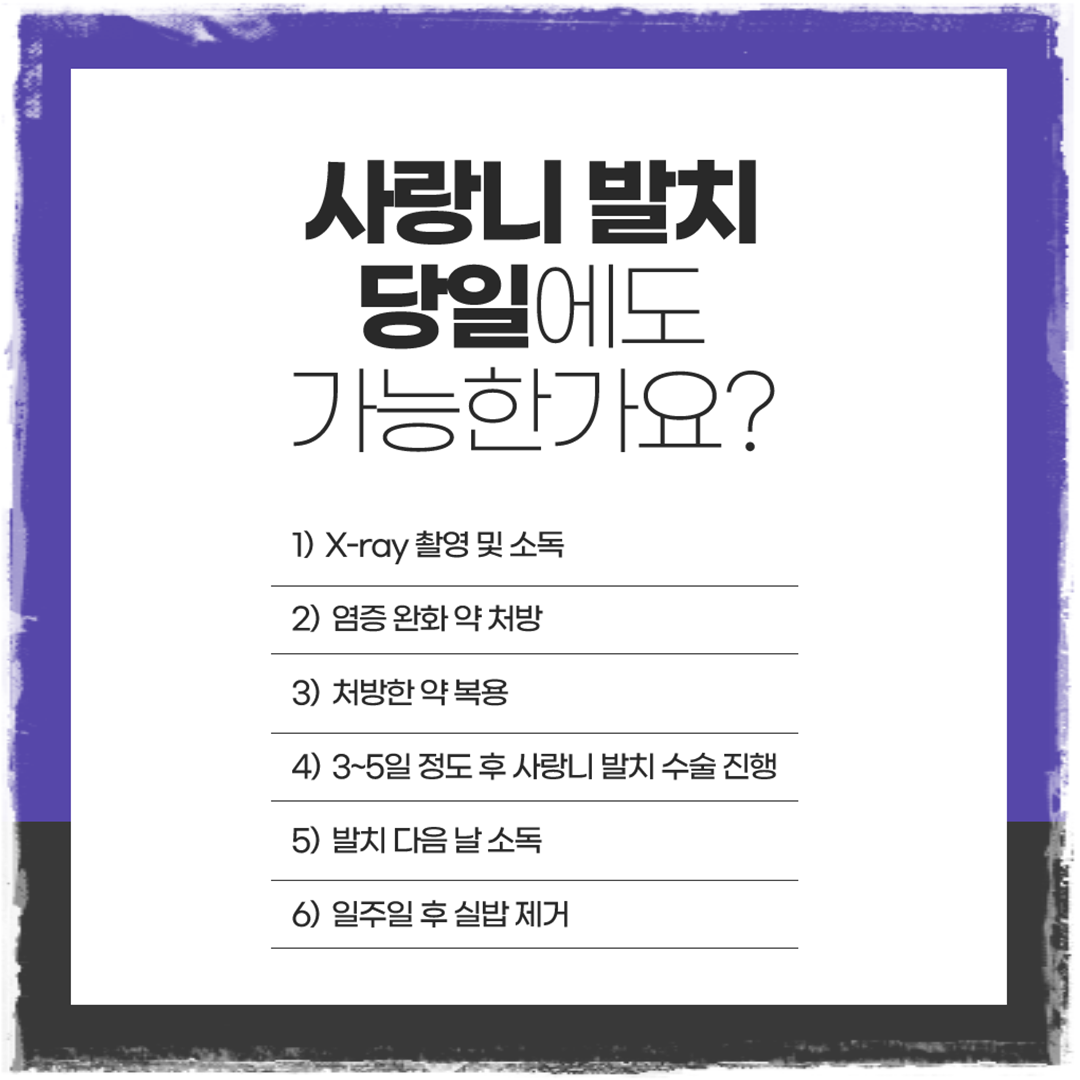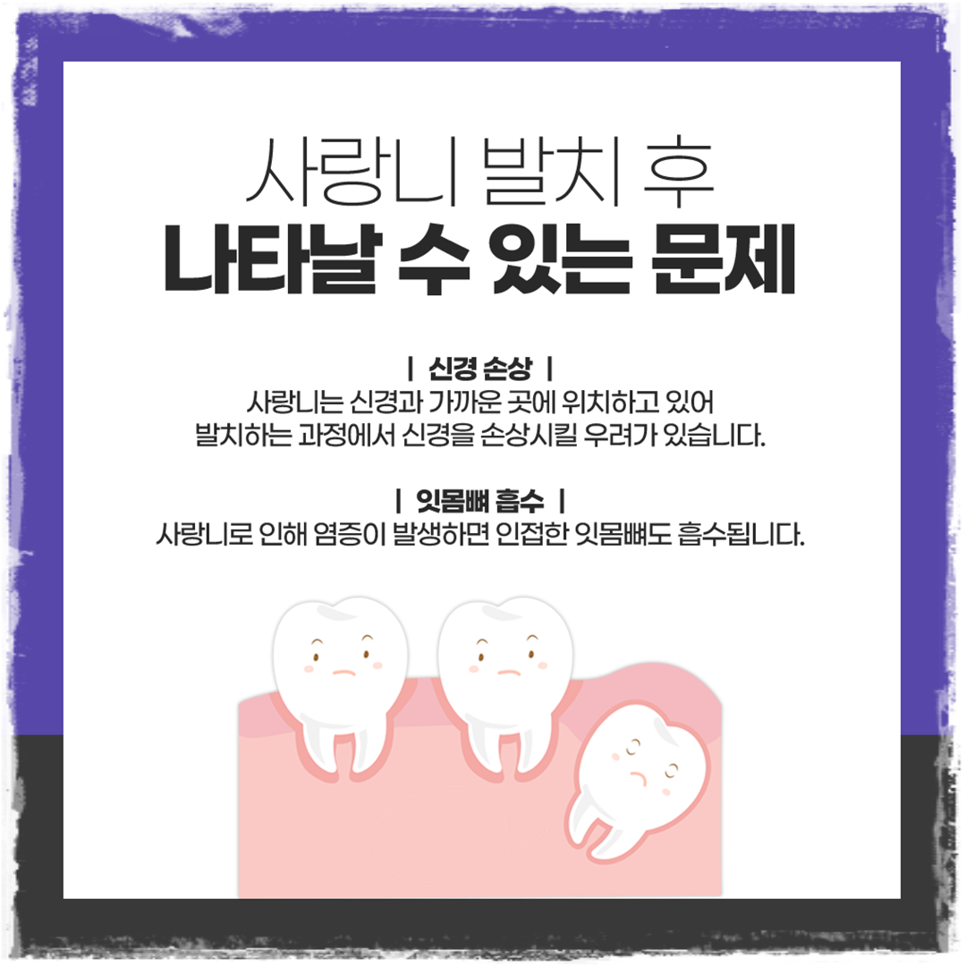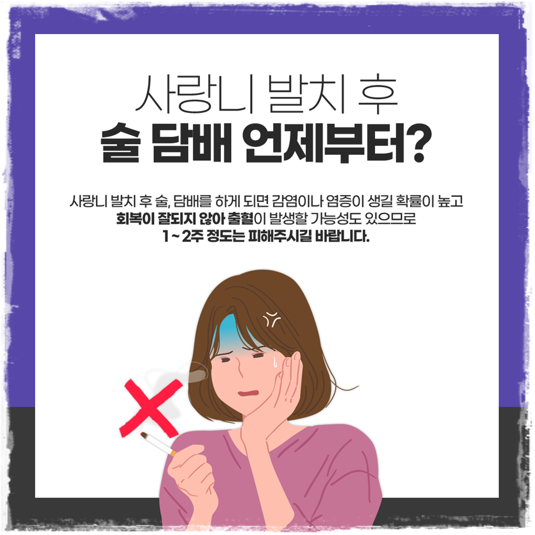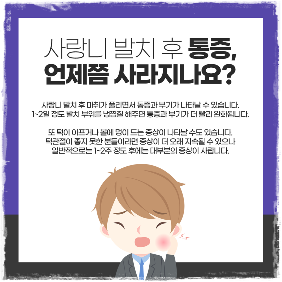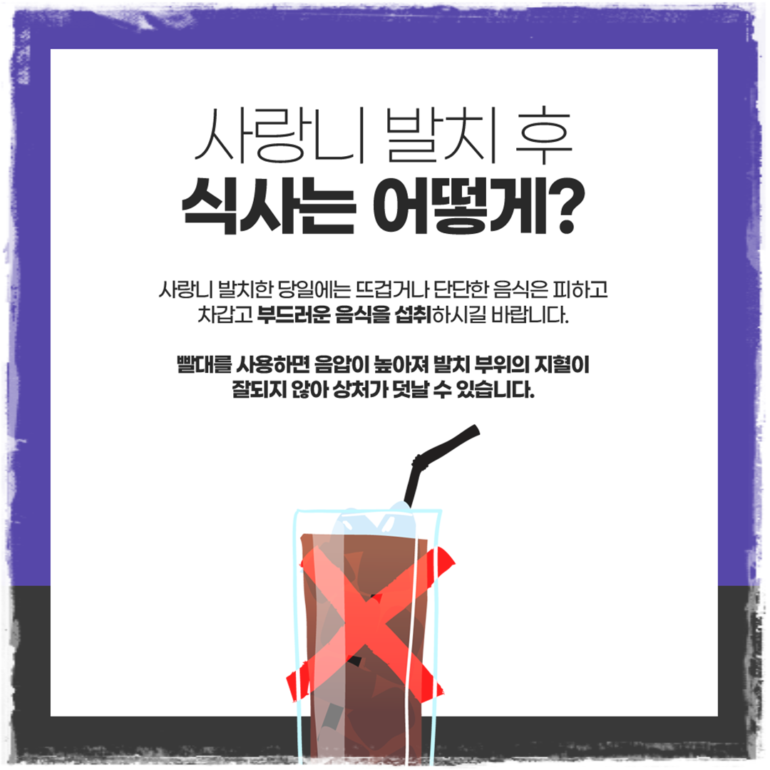 사랑니는 마취 후 발치를 하기 때문에 마취가 풀리기 전까지는 통증이 거의 없는 편인데요. 의료진 지시에 따라서 진통제 복용과 얼음찜질을 통한 부기 완화에 도움을 줄 수 있습니다. 수술 이후 하루 동안은 음식물을 섭취하지 않는 것을 권장합니다. 이후 자극적이지 않은 미지근한 온도의 유동식 식사를 권장하는데요. 염증이 생기지 않도록 구강 위생을 철저하게 해주는 것이 중요합니다. 일주일 정도 의료진 지시에 따라 검진을 받고 원활하게 회복할 수 있도록 해야 합니다.