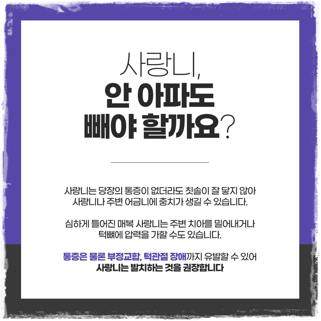 이전에는 분당사랑니가 질기고 큰 음식을 잘 분해하고 섭취하도록 하는 데에 큰 도움을 주기도 했지만 현대인들의 식생활 습관이 부드러운 서구화로 변화하게 되면서 사랑니가 자리를 잡기 어려운 경우들이 많아졌습니다. 때문에 분당사랑니가 정상적이지 않은 형태로 맹출하거나 주변 치아를 밀어내고 압박하게 되어 여러 증상을 유발하게 될 수 있어 빠른 진단과 조치를 권장하고 있어요.
