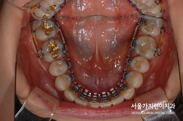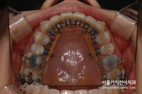 교정으로 할 때 임플란트의 존재와 임플란트 주변의 치아이동에 제한이 있다는 점을 염두하고 치아교정 계획을 수립해 진행하기로 했습니다. 또한 설측교정 방식을 적용해 치료를 진행했는데요. 두 개의 와이어로 설측탄댐교정을 진행해 치아이동에 필요한 힘을 안정적으로 주었습니다. 여기에 잇몸에 미니스크류를 식립해 고정원으로 삼고 이동을 시켰는데요.