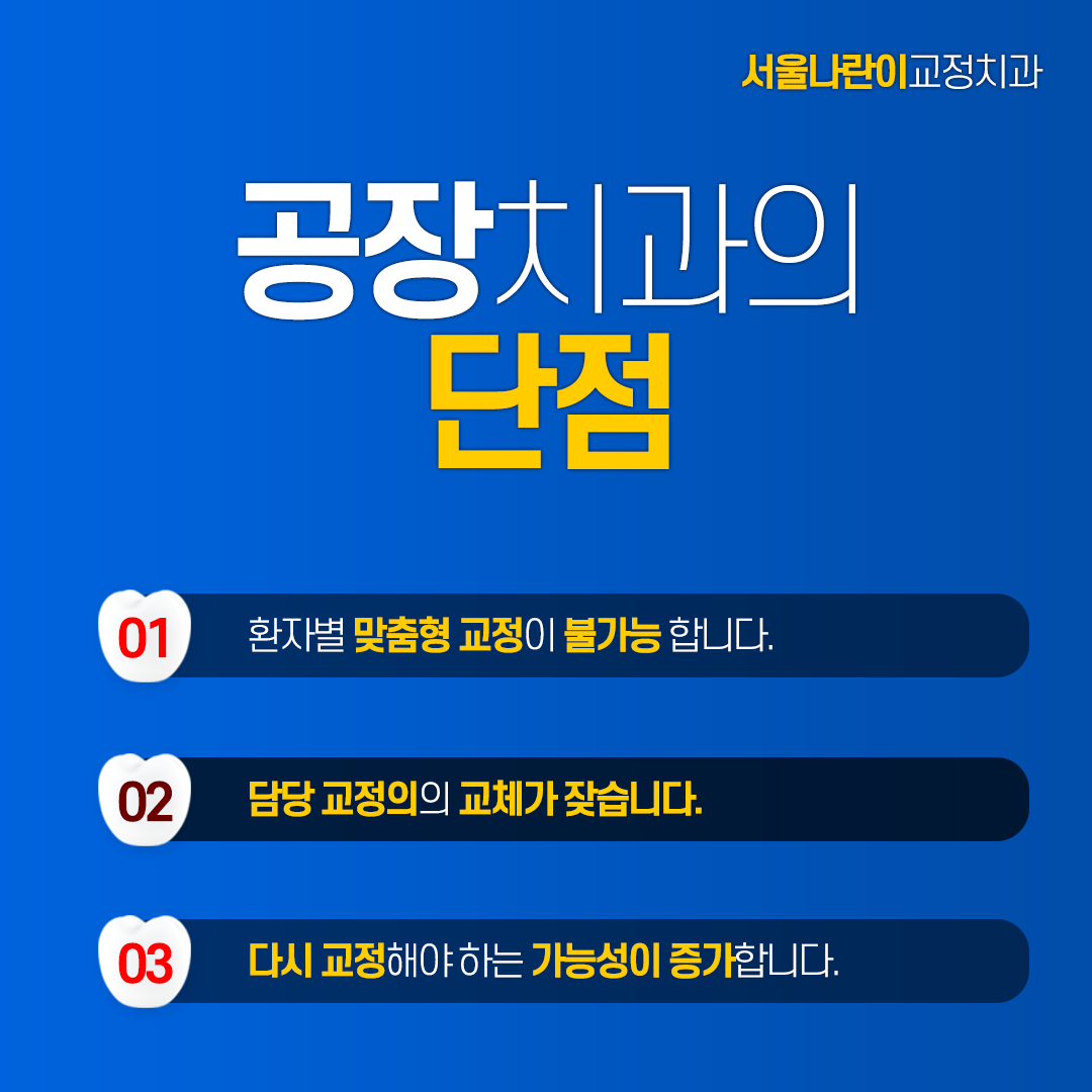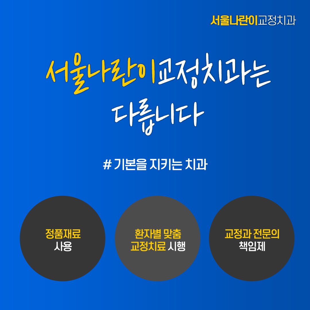 치아교정은 1:1 맞춤진단은 당연하고 치아교정 전문의의 전담관리가 이루어져야 합니다. 치료가 끝난 후에도 아름다움과 치아건강을 동시에 얻을 수 있어야 하죠.