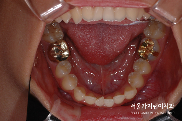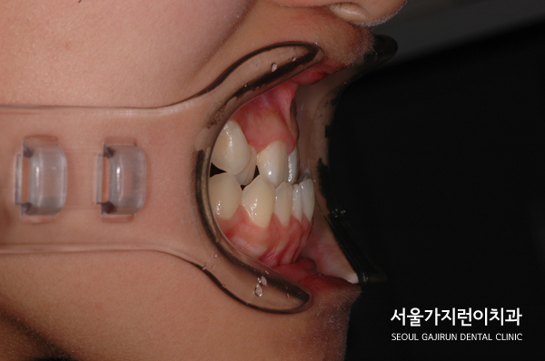 여기에 상악골의 열성장으로 인해 앞니가 거꾸로 물린 상태였습니다. 교합이 어긋나 있기 때문에 저작도 어려운 상태였는데요. 이런 문제점을 보고 저희 치과에서는,