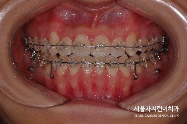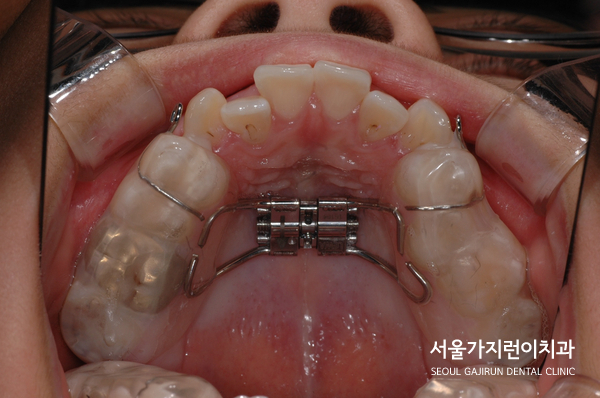 악궁확장장치를 사용해 좁은 상악골을 하악에 맞춰 넓혀주는 교정을 시행했습니다.