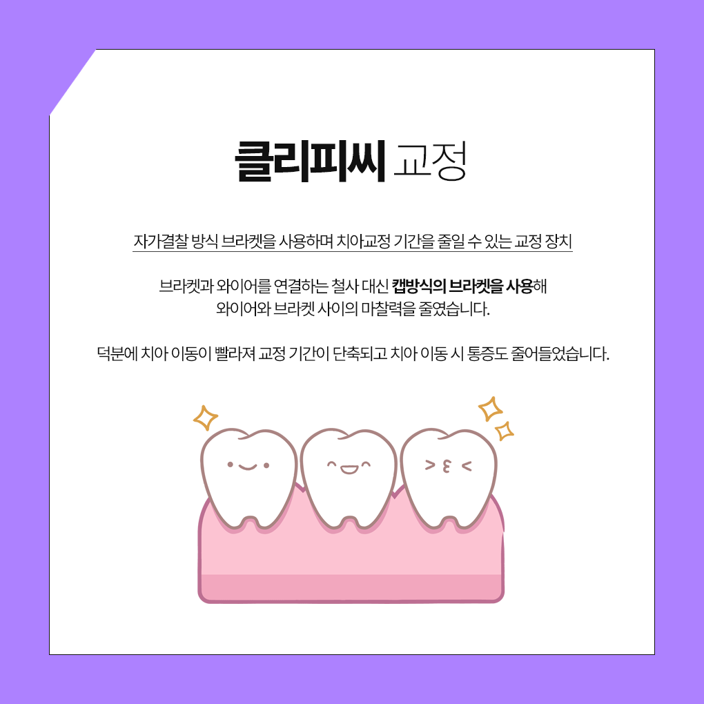 임플란트뿐만 아니라 치아교정에서 기간과 방식에 큰 영향을 미치는 요소 중 하나는 바로 어떤 장치/제품을 선택하느냐 인데요. 어떤 장치를 이용하느냐에 따라서 치료 중 심미적인 부분과 치료 기간이 달리지기 때문에 환자님께서 추구하시는 방향으로 신중하게 선택하셔야 하는데요. 만약 빠르게 치아교정을 끝내고 싶으시다면 본원에서 "빠른교정 과정"으로 치료기간을 단축하실 수 있습니다. 장치를 부착한 뒤에 와이어를 끼워 점점 조이는 방식인 일반 장치에 반해, 자가결찰장치를 사용하여 장치의 마찰력을 감소시켜 치열 이동을 빠르게 유도하여 빠르게 진행되는데요.