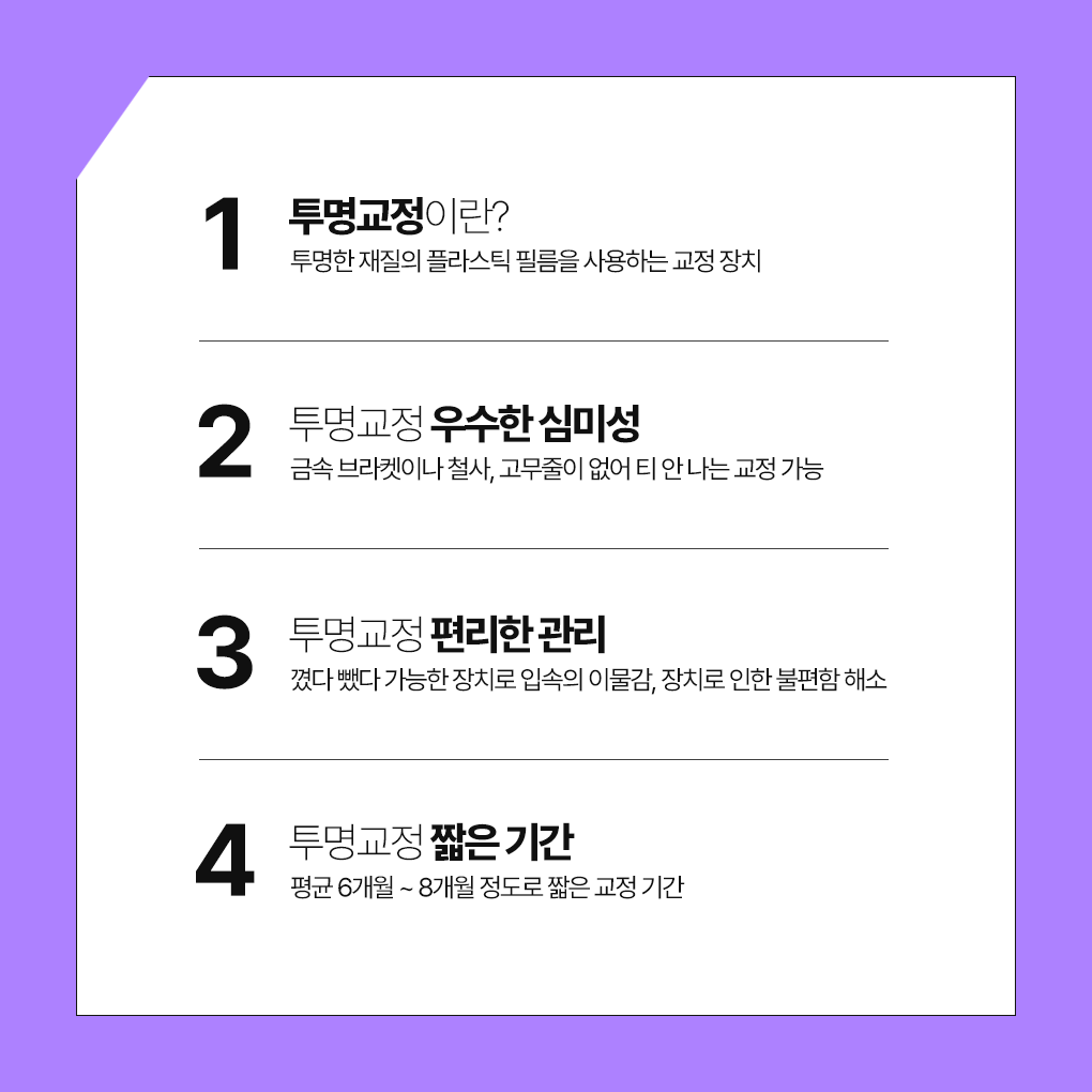 설측장치는 장치 자체를 자연치 안쪽에 부착해 아예 장치가 보이지 않도록 설계하는 방법으로 당장 결혼식이나 취업을 앞둔 상황에서도 부담 없이 시작하실 수 있습니다. 투명장치는 최근에 각광받기 시작한 방법인데요. 투명한 틀라스틱 틀을 환자님의 구강 상태에 맞게 본떠 3주 주기로 교체해 주면서 점점 치열을 조여 주는 방식입니다. 환자님 스스로 탈부착이가능 하여, 위생 관리가 용이하며 일상, 사회 생활에 지장을 주지 않는다는 점이 가장 큰 장점입니다.