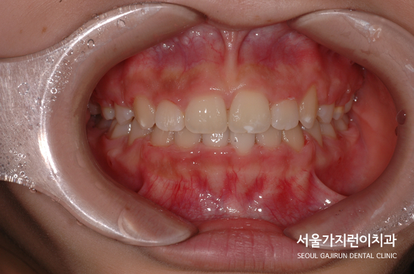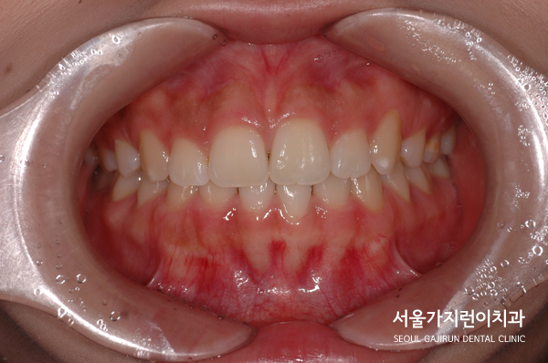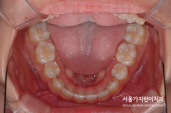 치료가 진행 되고 있을 때 찍은 사진인데요. 환자분의 경우 상악 치아가 하악 치아를 약간 덮고 있는 정상적인 교합으로 돨온 것을 확인할 수 있었습니다. 비뚤어진 치열도 말끔하게 배열되었는데요. 이와 동시에 무턱 증상도 많이 개선되어 교정이 끝난 후 4년 6개월간 안정적으로 유지된 것을 볼 수 있었습니다.