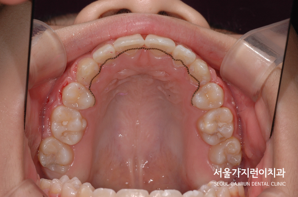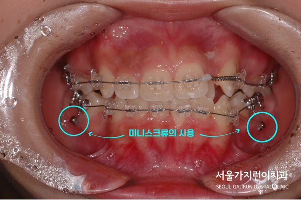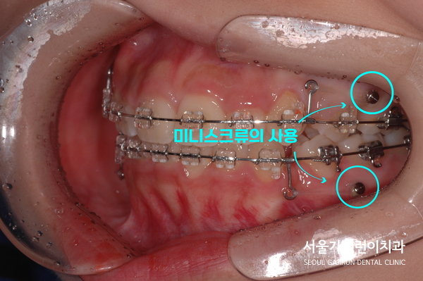 환자분의 경우 덧니 형태로 자리 잡았던 측절치를 발치를 진행했습니다. 치아이동의 공간을 확보하기 위해 상하악 제1소구치도 발치하게 되었는데요. 발치를 통한 공간은 전치의 후방이동에 사용했는데요. 초기부터 미니스크류를 이용해 충분한 힘을 주어 치아의 뿌리까지 안전하게 이동시켰습니다.